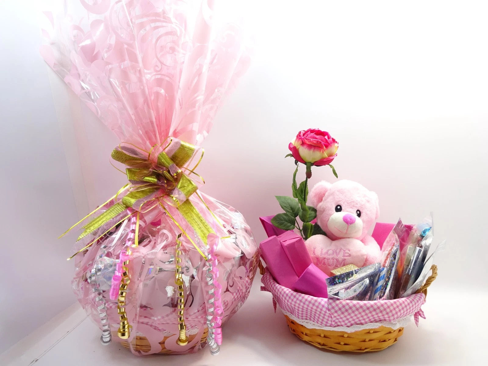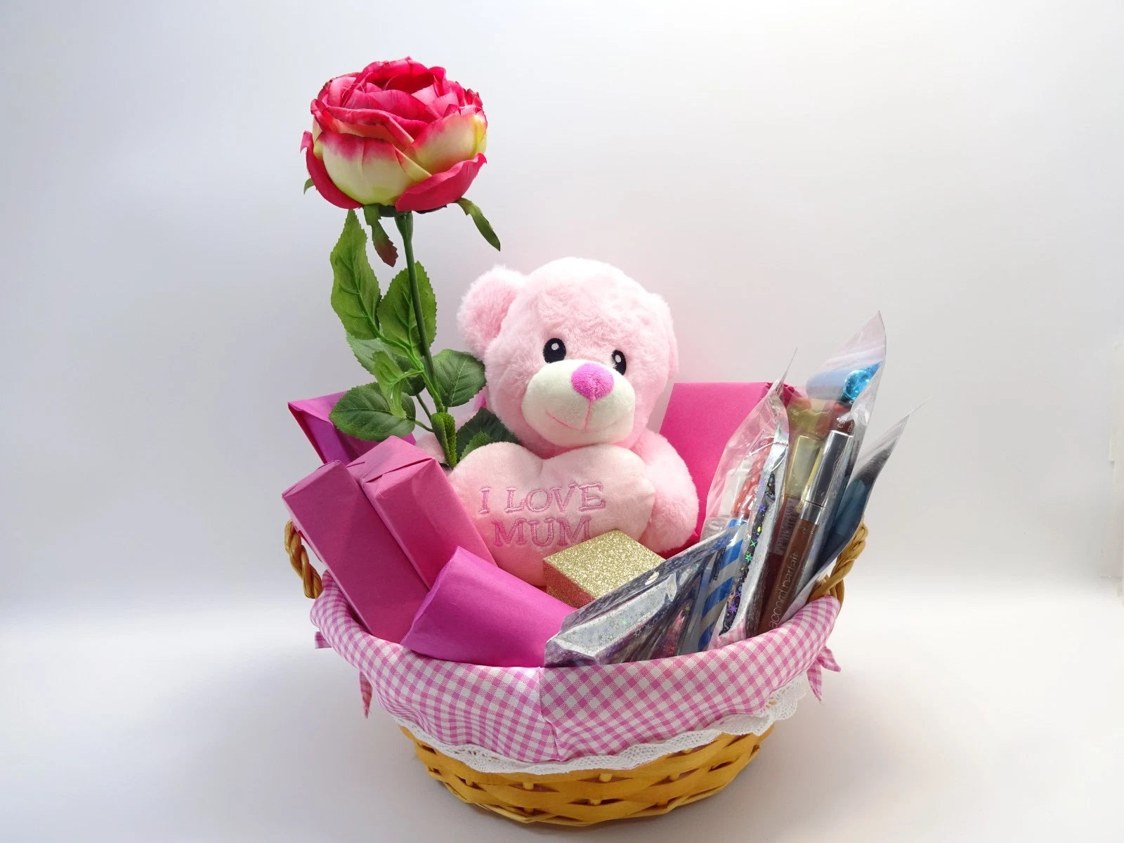 The hamper is fully gift wrapped in decorative pink printed cellophane and finished with a large gold and pink statement bow, complete with curling ribbons for an eye-catching presentation. Inside, a soft pink “I Love Mum” teddy and a romantic artificial red rose add a sentimental touch she can treasure long after the occasion.