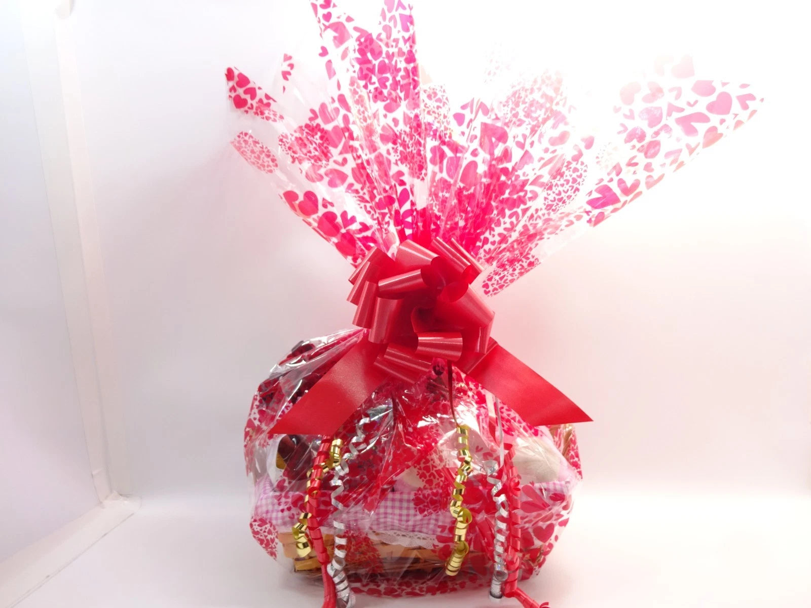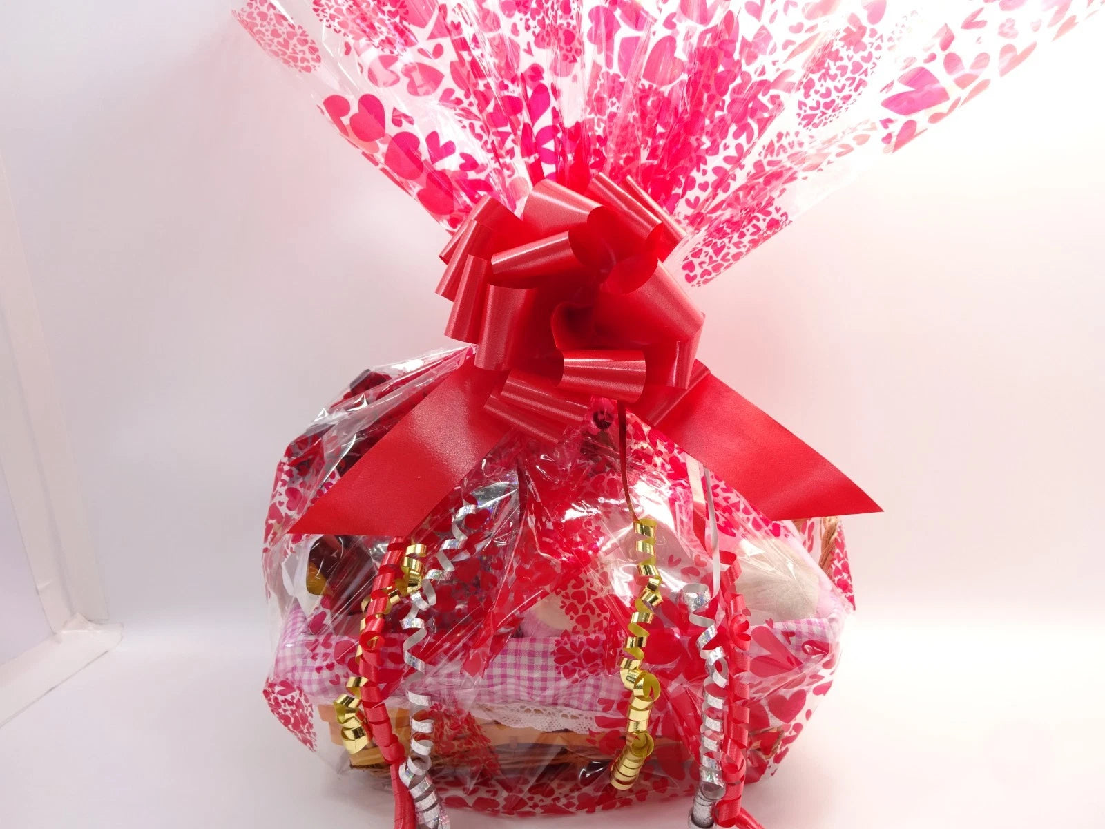 Lovingly handmade by Glory Cosmetics, this luxury wicker basket is lined with pink gingham fabric and professionally gift wrapped in elegant red heart-print cellophane, finished with a large statement red bow and decorative ribbon curls for a stunning presentation.