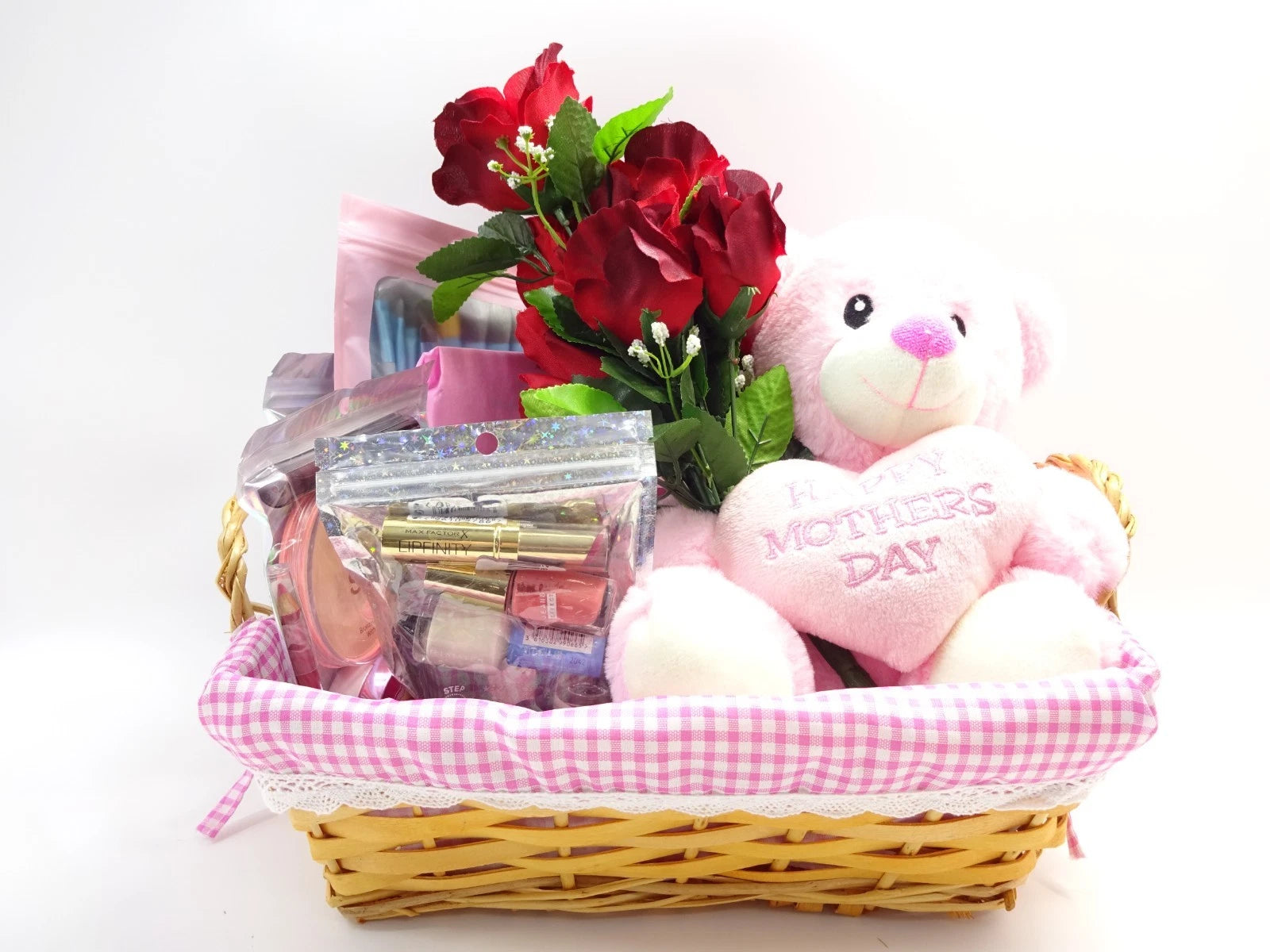 Inside sits a soft pink “Happy Mothers Day” teddy bear holding a heart cushion, accompanied by a bouquet of artificial red roses to add a timeless romantic touch. The hamper arrives fully assembled and beautifully wrapped — ready to gift immediately.