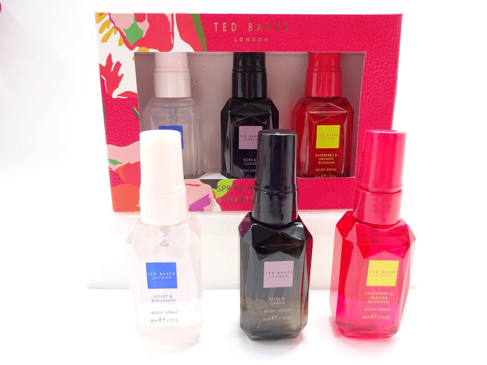 Includes Ted Baker mini body spray trio – Violet & Bergamot, Rose & Cassis, Raspberry & Orange Blossom