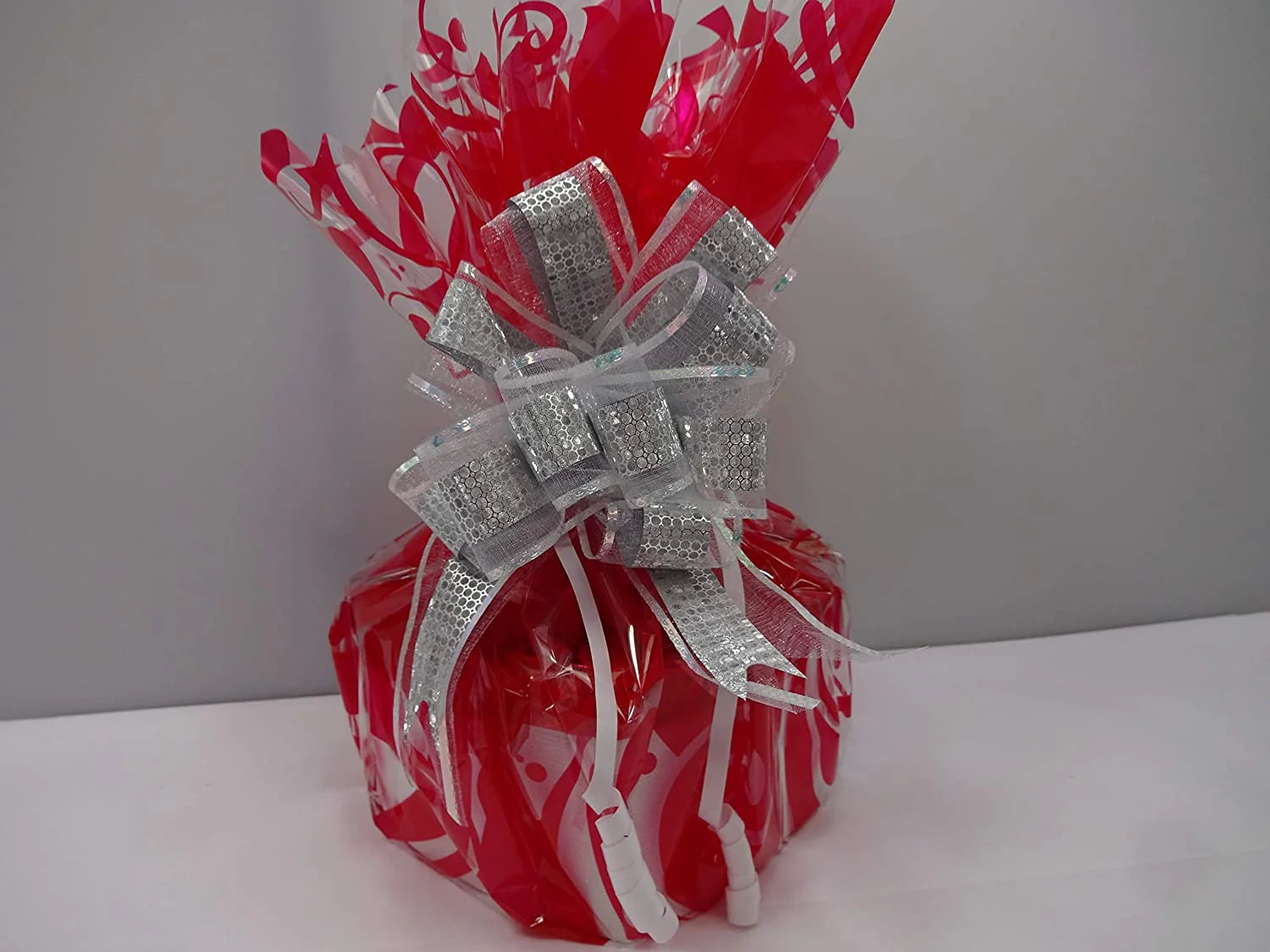 all items are tissue wrapped and placed in a heart shape gift box gift wrapped in red design cellophane wrap, finishing with a large bow.
