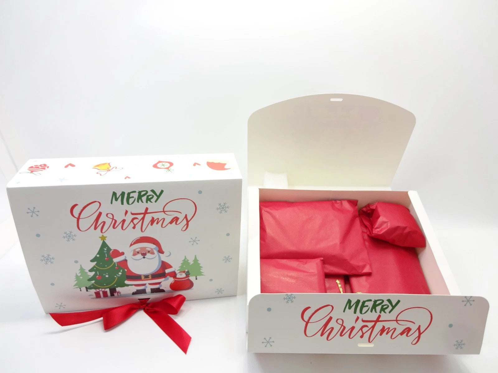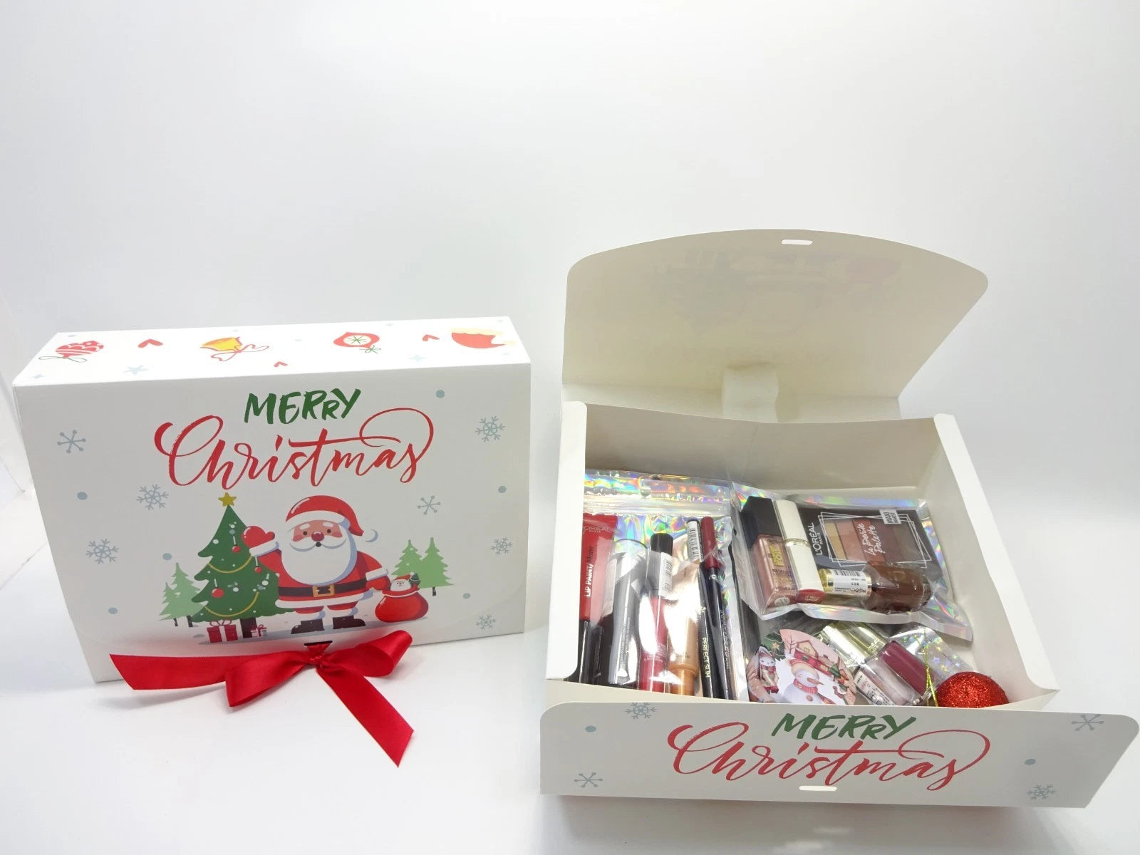 All items are organised in holographic pouches, beautifully tissue wrapped inside a white Merry Christmas gift box with a festive Santa design and finished with a luxurious red bow — the perfect presentation for a joyful surprise this holiday season.
