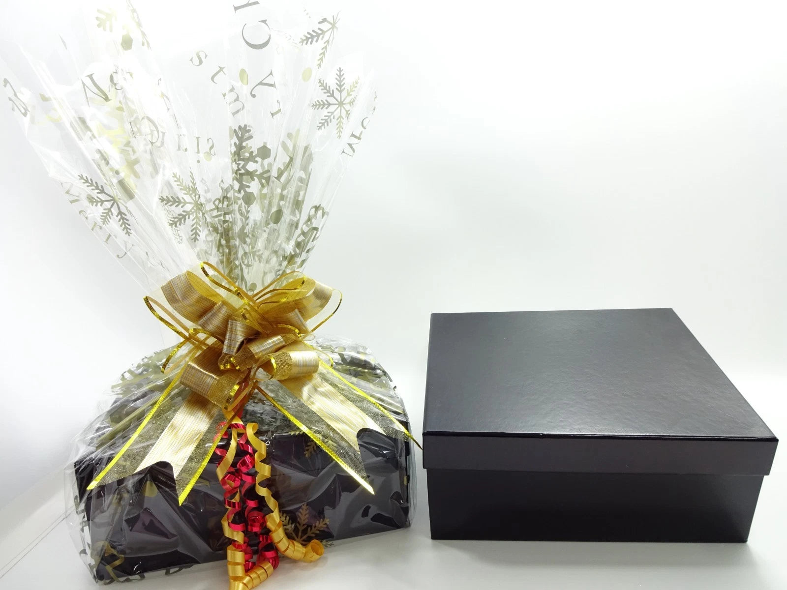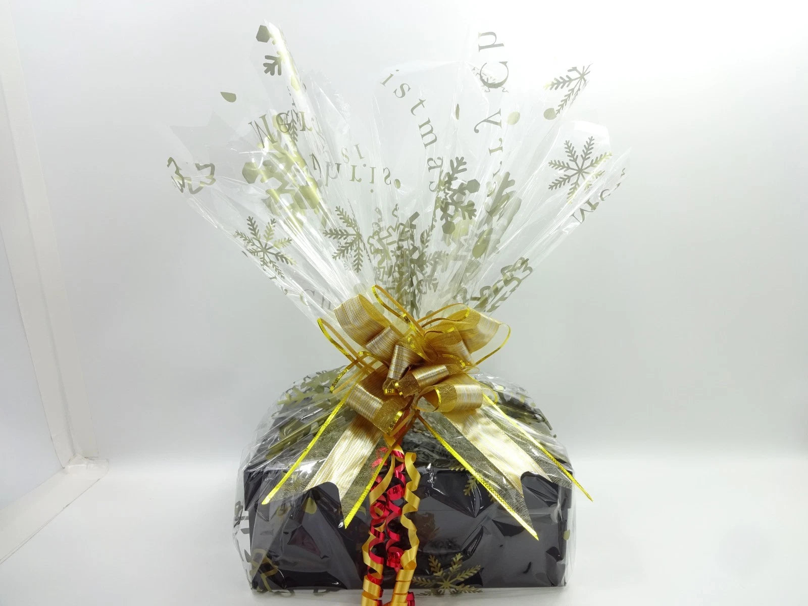 Premium festive presentation: Fully wrapped in high-quality gold-snowflake cellophane with a large gold bow and decorative ribbon curls.