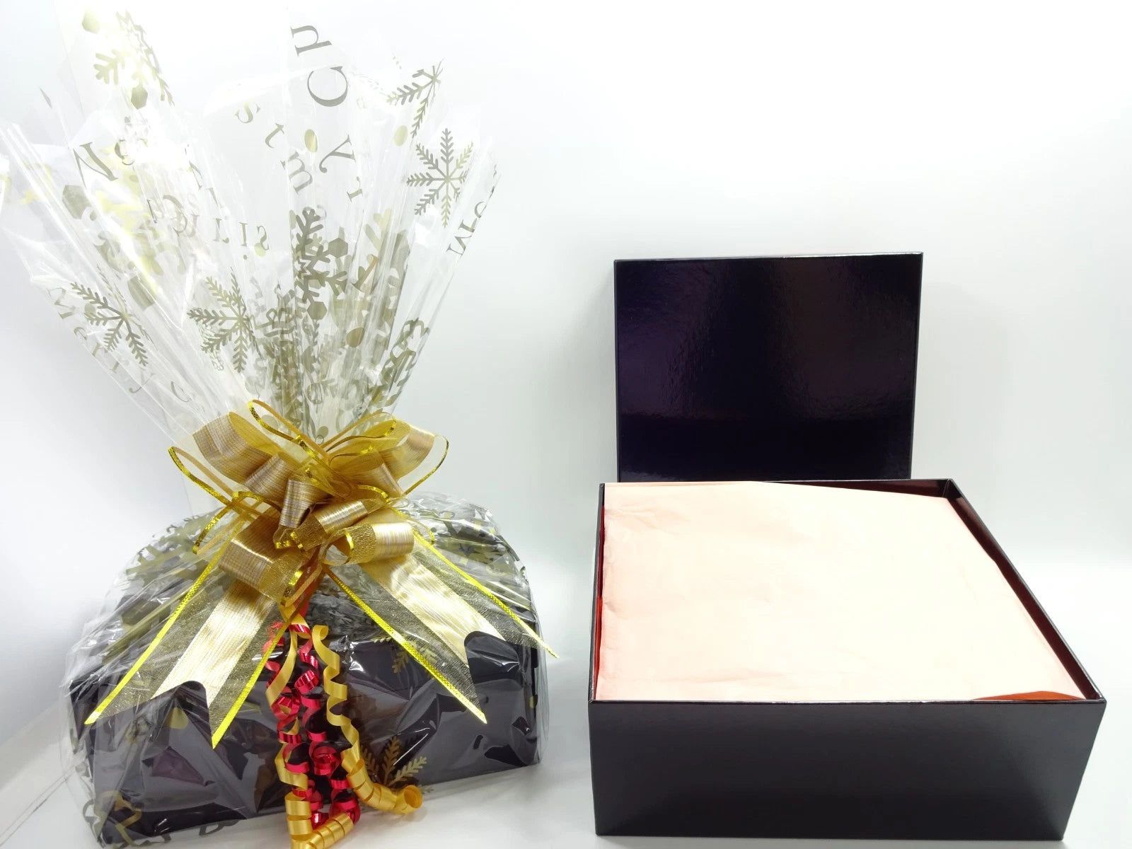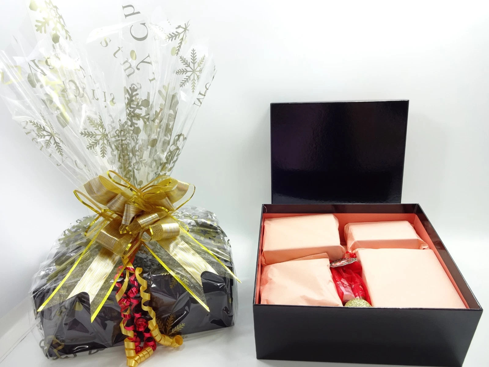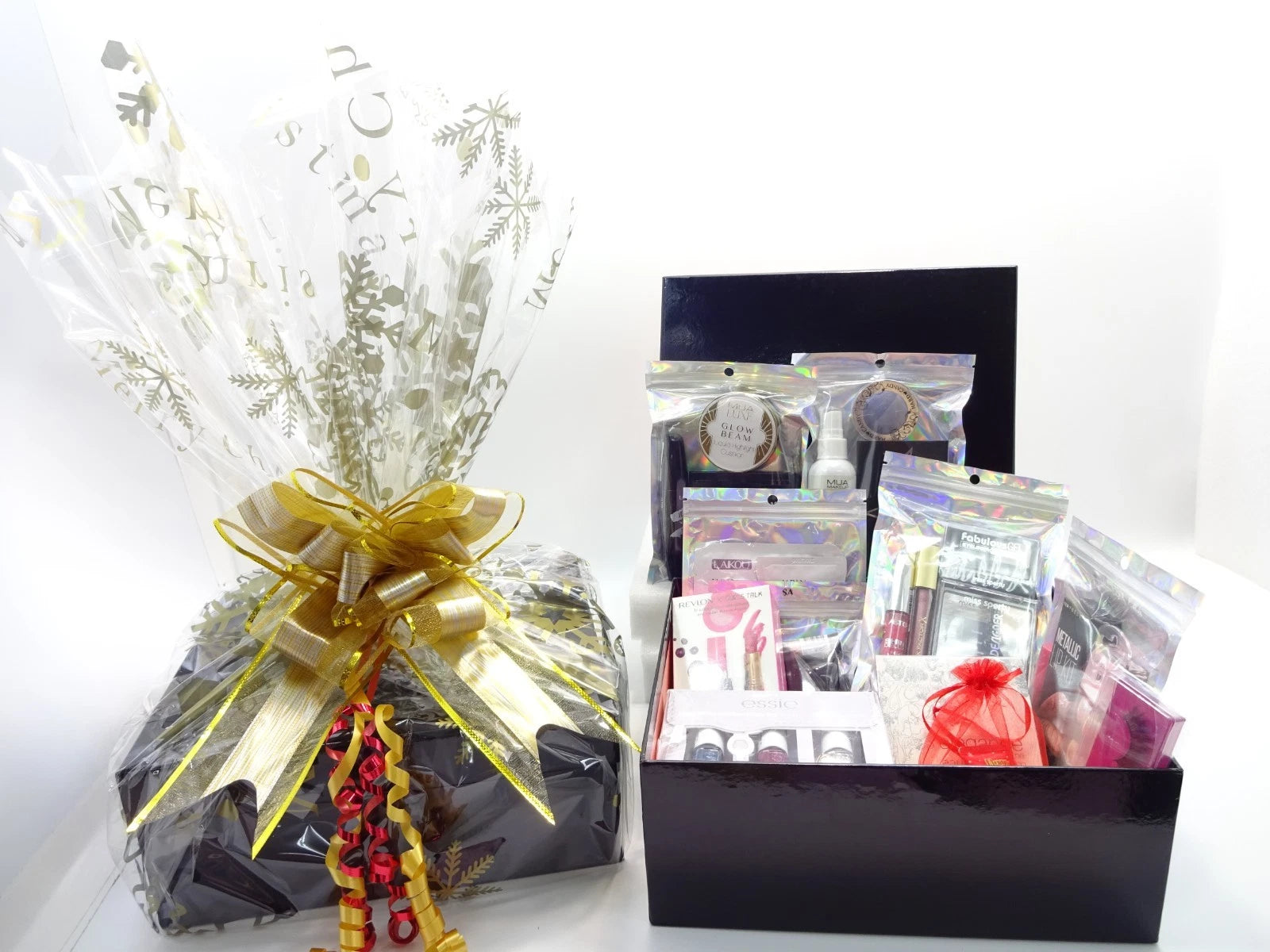 Each item inside the hamper is arranged in transparent zipped pouches, neatly tissue-wrapped and arranged inside a premium black keepsake box, which is then fully wrapped in gold-themed snowflake cellophane and tied with luxury ribbons for a stunning presentation that feels truly special when opened.