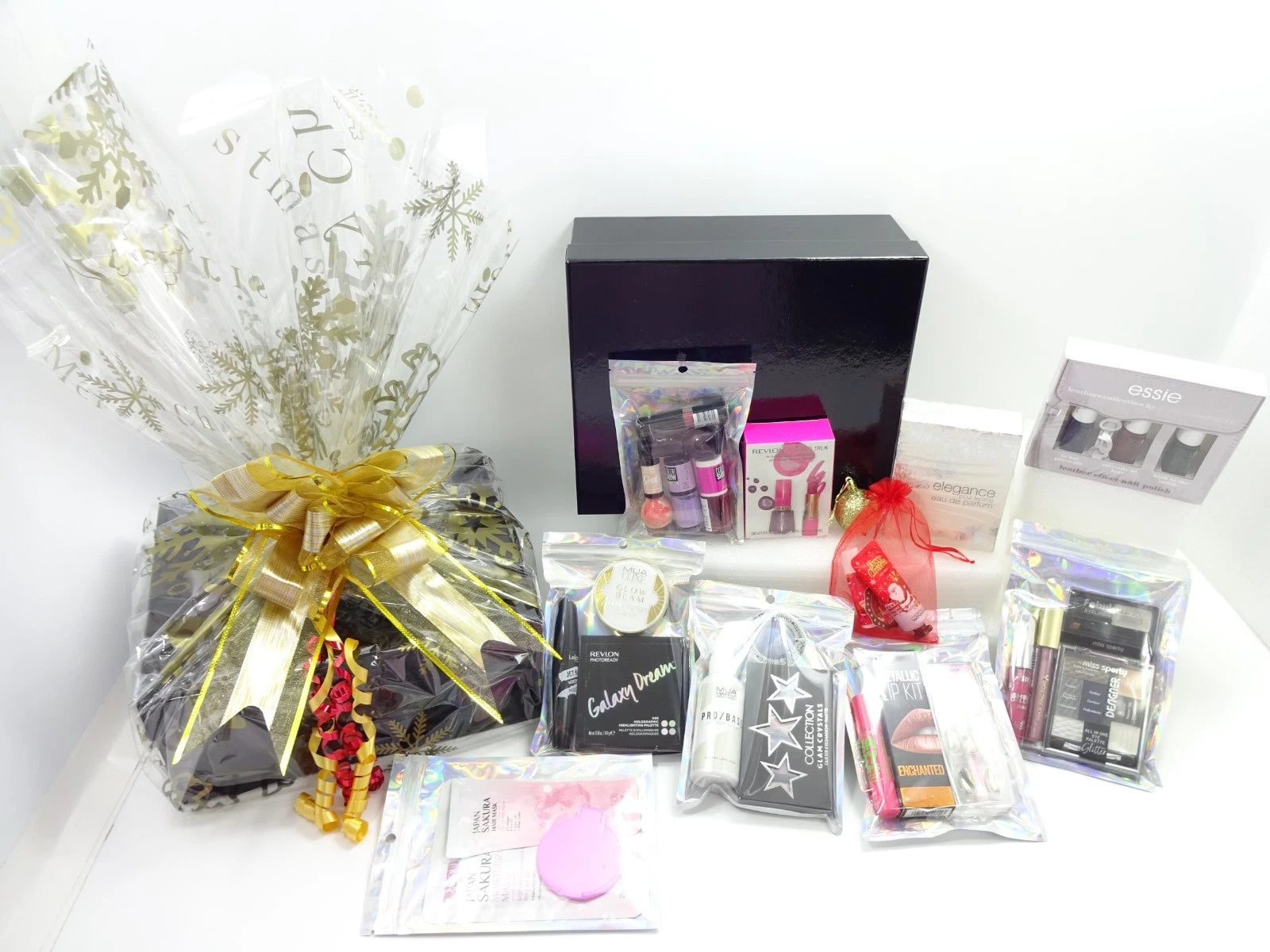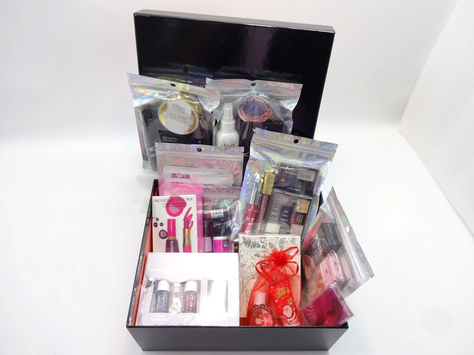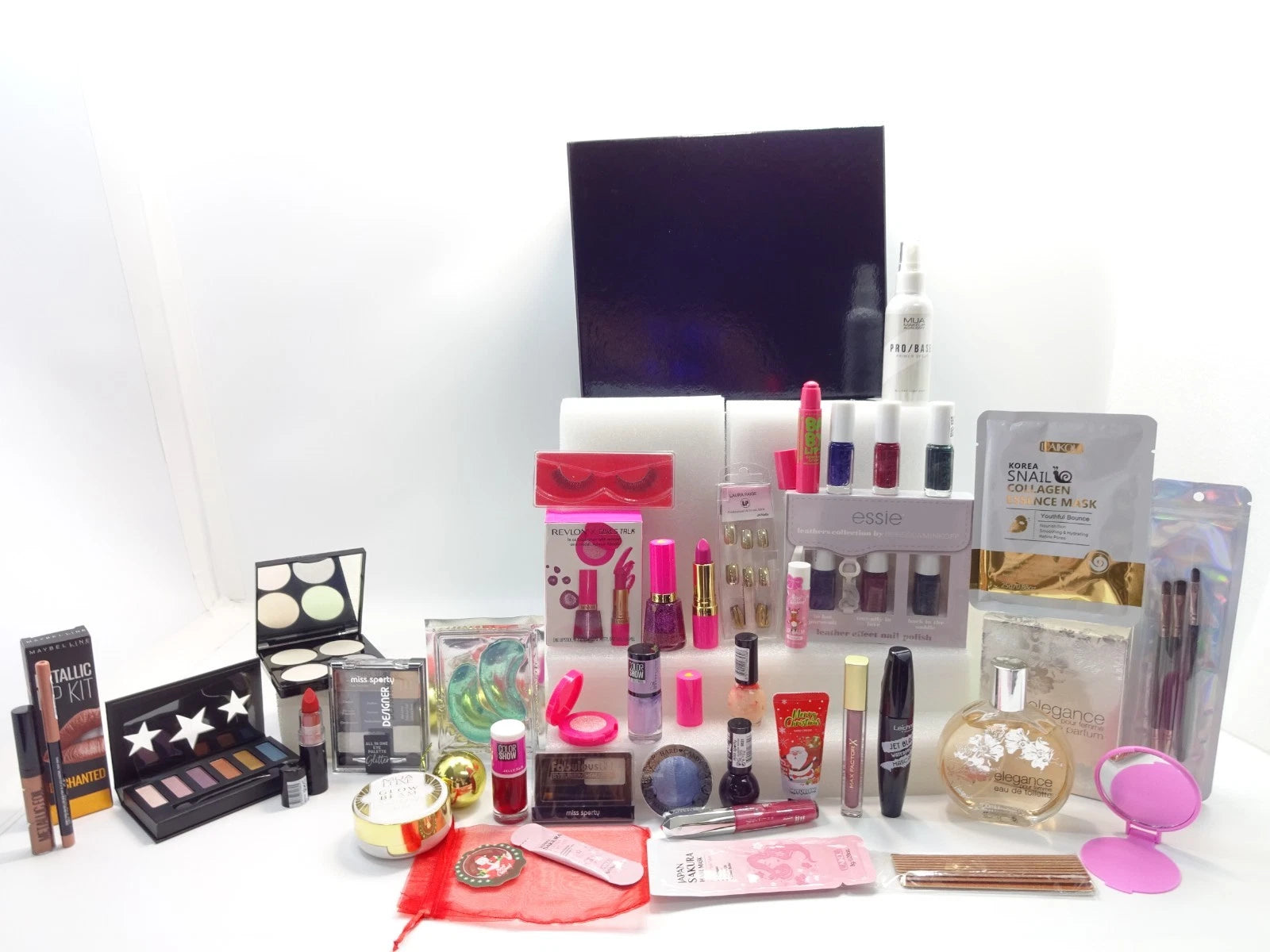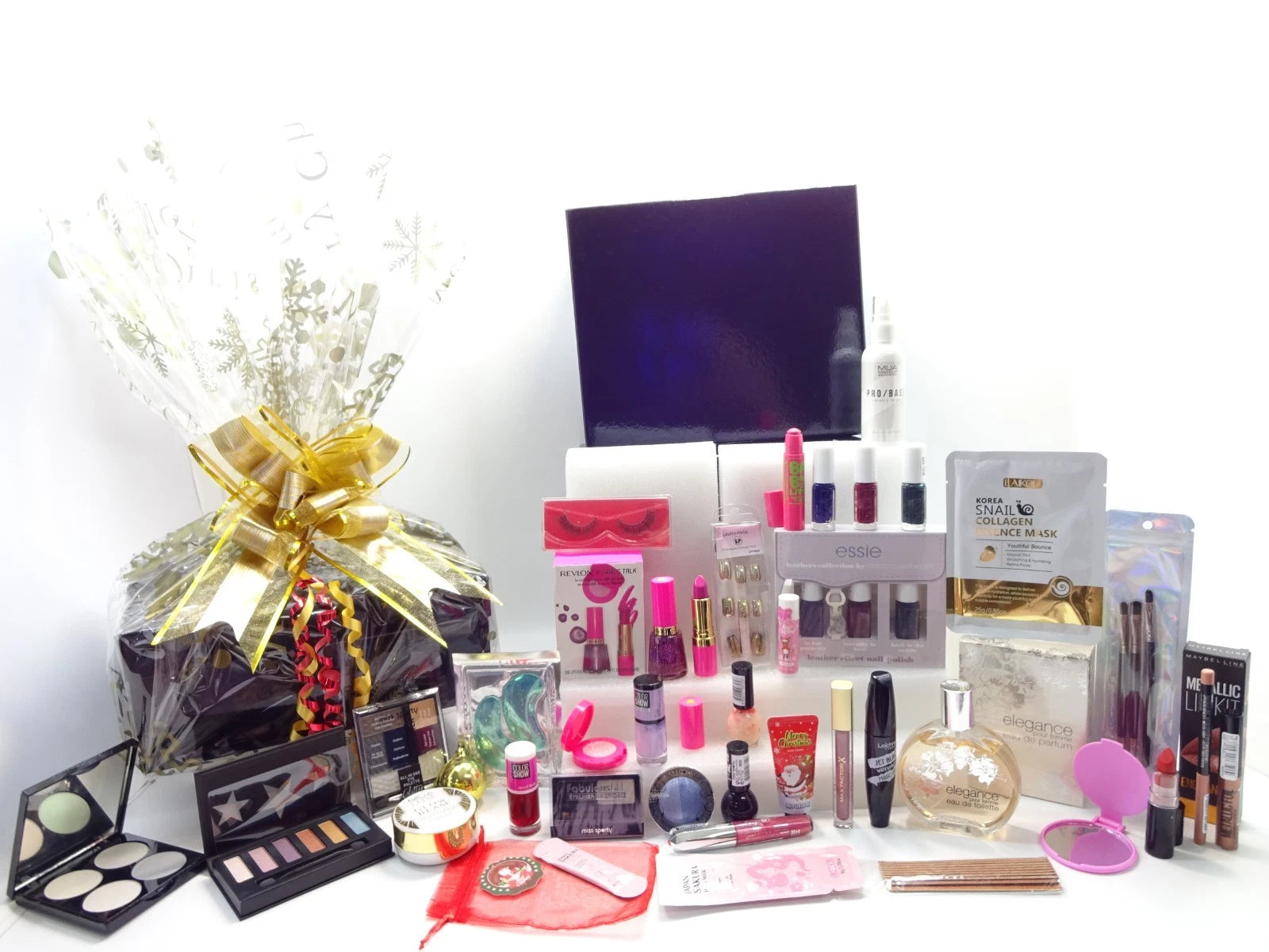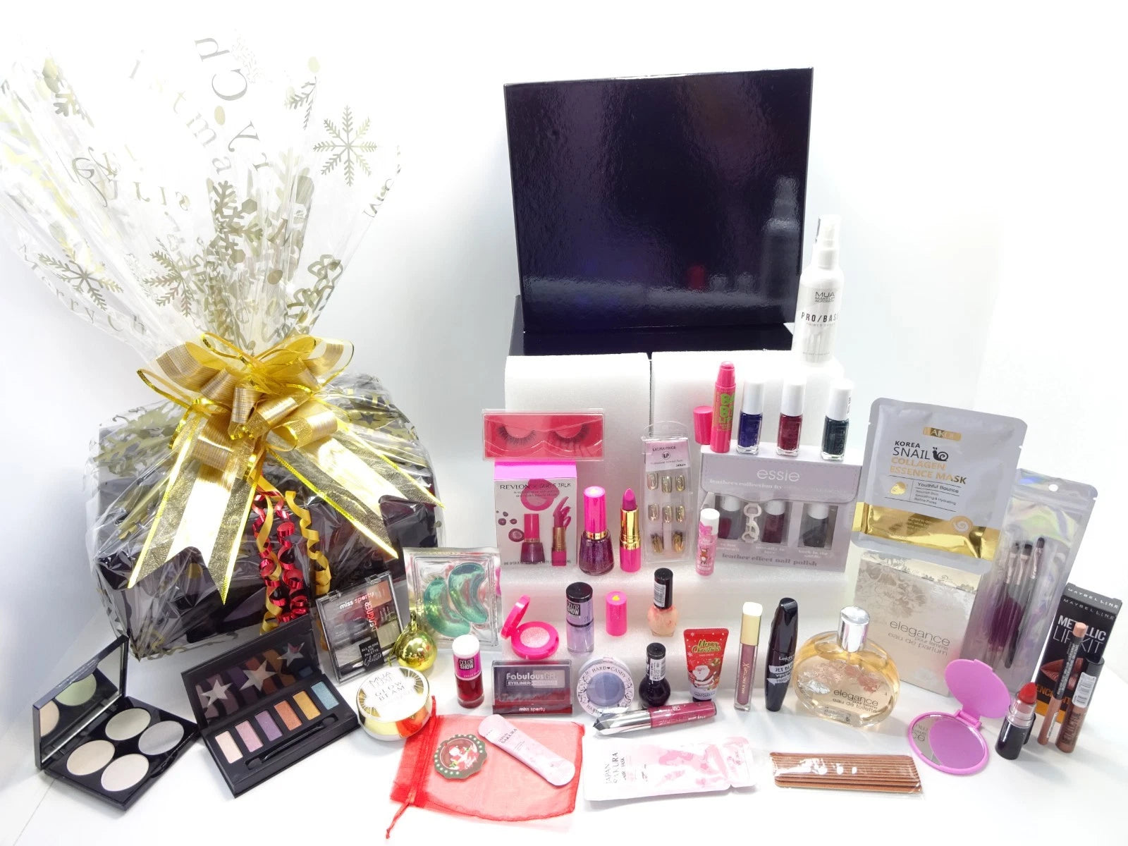 Features Perfume 100ml, Face eye Hair Masks, face palettes, nail lip kits, make up brushes, lashes, nail polish, primer spray glow powder, mascara brow kit, eye palette, lip glosses Lipsticks, make up brushes, Hand Cream,
