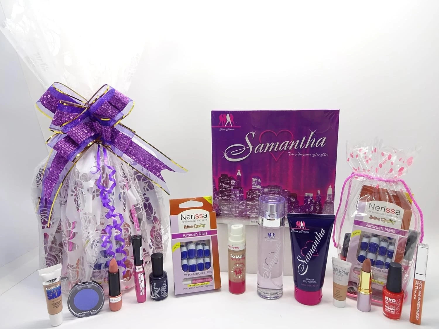 (samantha 50 ) Gift Hamper Includes: 1 x Samantha 2pc Perfume Gift Set For Women,100ml EDP Perfume & 175ml Shower Gel, 1 x Gymy Mayb Colour Show Eye Shadow 10 Soho Blue,1 x Gymy Mayb Colour Sensational Lip Gloss 460 Electric Orange, 1 x Gymy Mayb Better Skin Concealer 03 Medium 11ml, 1 x Rimmle Lipstick Nude, 1 x Saffron Lipstick, 1 x Miss Beauty Nail Polish Polish, 1 x N.Y.C Nail Polish Red, 1 x Mis Sporty So Matte Foundation Dark 30ml,1 x Miss Sporty Lip Gloss Pink, 1 x Pack Of 24 Nail Tip, 1 x Free Mayb Foundation 10ml, All Make Up Items Come In A Make Up Pouch, Set Comes Gift Wrapped In Gift Hamper Finishing With A Bow