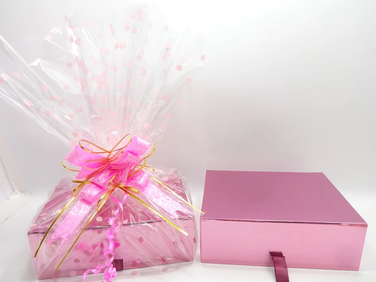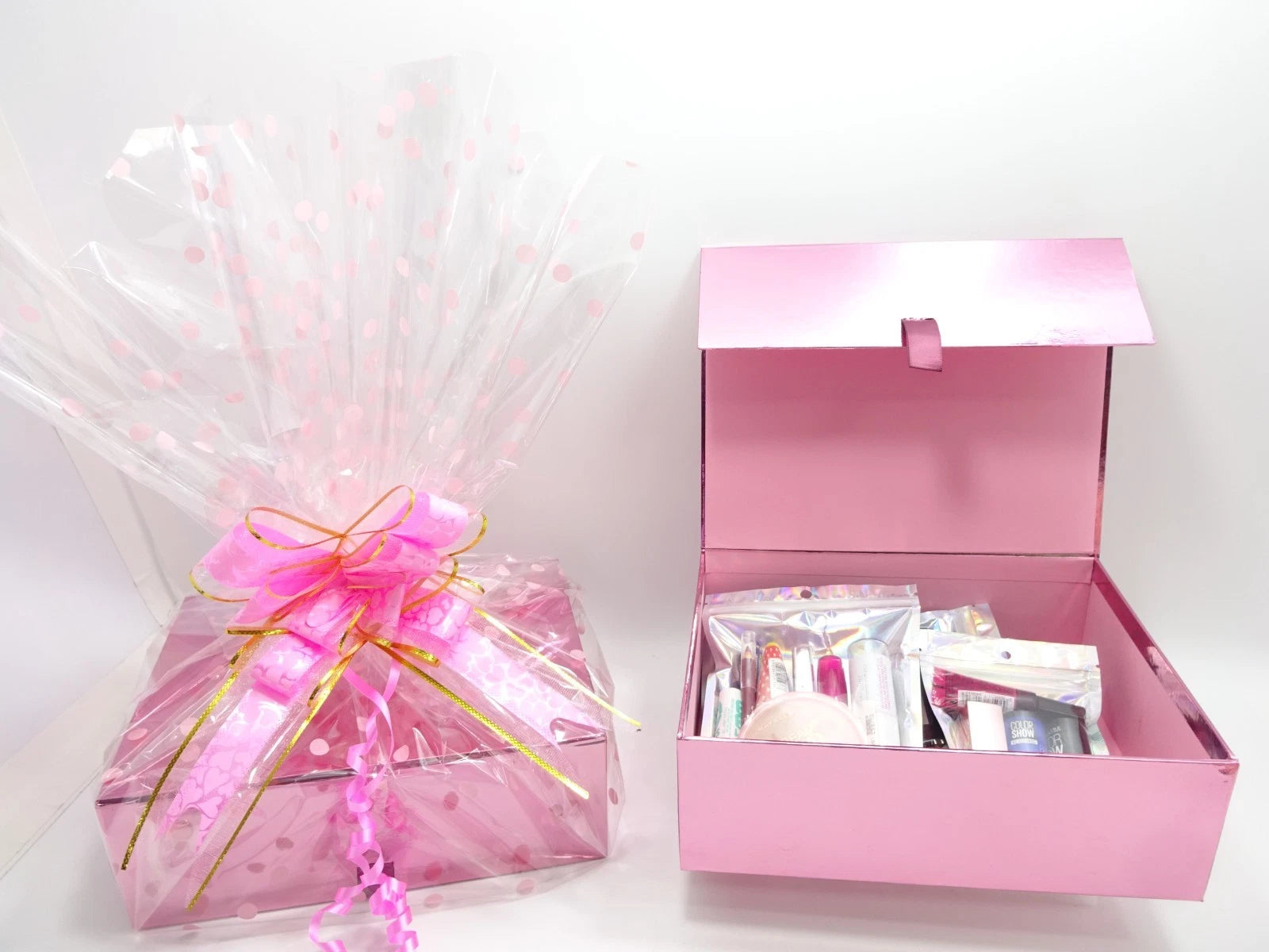 All items are carefully arranged in transparent foil pouches and tissue wrapped and arranged inside a premium pink magnetic closure luxury gift box, finished with clear cellophane wrap with pink polka dots, golden trims, and a decorative pink bow – creating a stunning gift presentation that’s ready to impress.