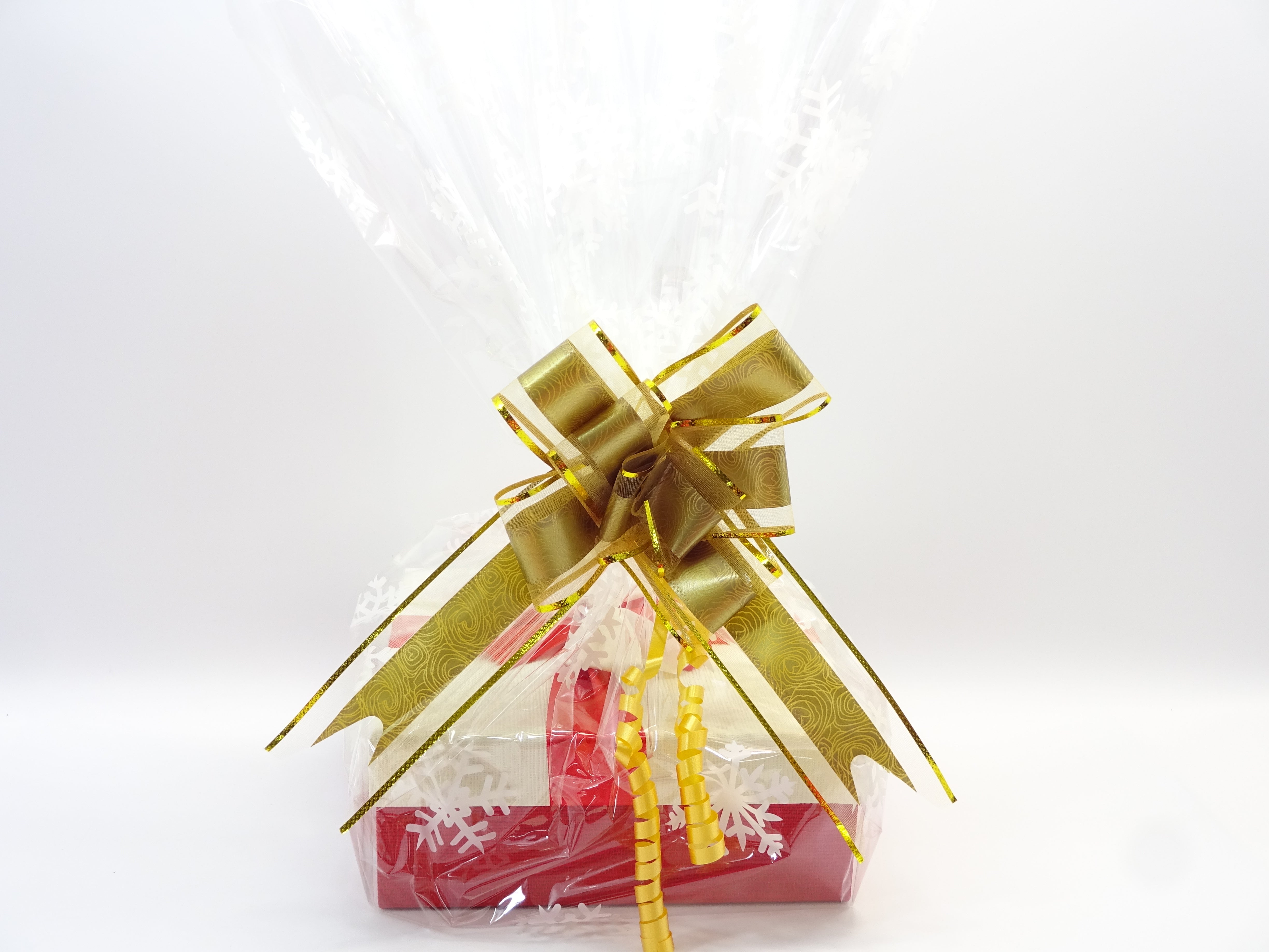 All items are beautifully arranged and carefully gift-wrapped. The bundle is nestled within a stylish red and white luxury box, expertly finished with a satin ribbon. The entire set is further wrapped in festive plastic featuring delicate snowflake designs, topped with a red and gold bow that adds an extra touch of Christmas cheer. This thoughtful presentation makes it an ideal gift for the holiday season or any special event.