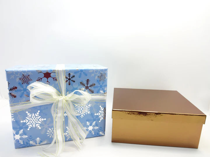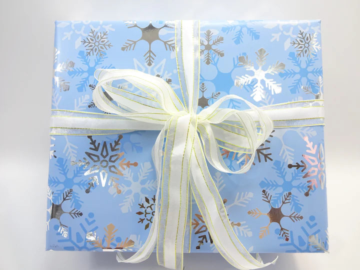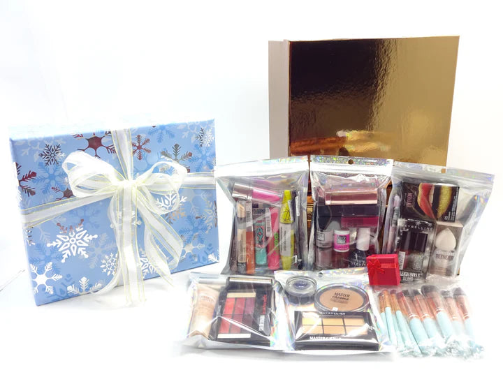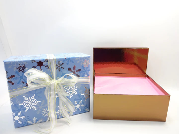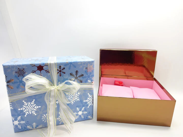 Every item is neatly arranged in transparent foil pouches, carefully tissue-wrapped, and presented inside a vibrant gold gift box, then finished with a snowflake-themed outer gift wrap and ribbon. A luxury presentation that makes the set perfect for festive gifting or personal indulgence.
