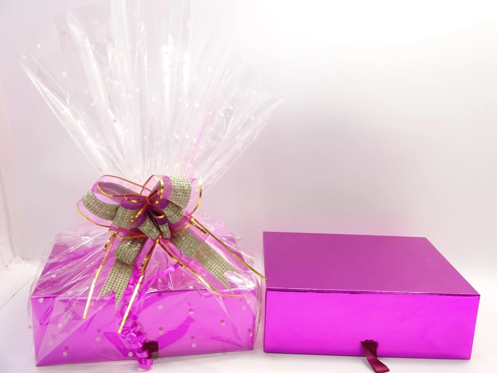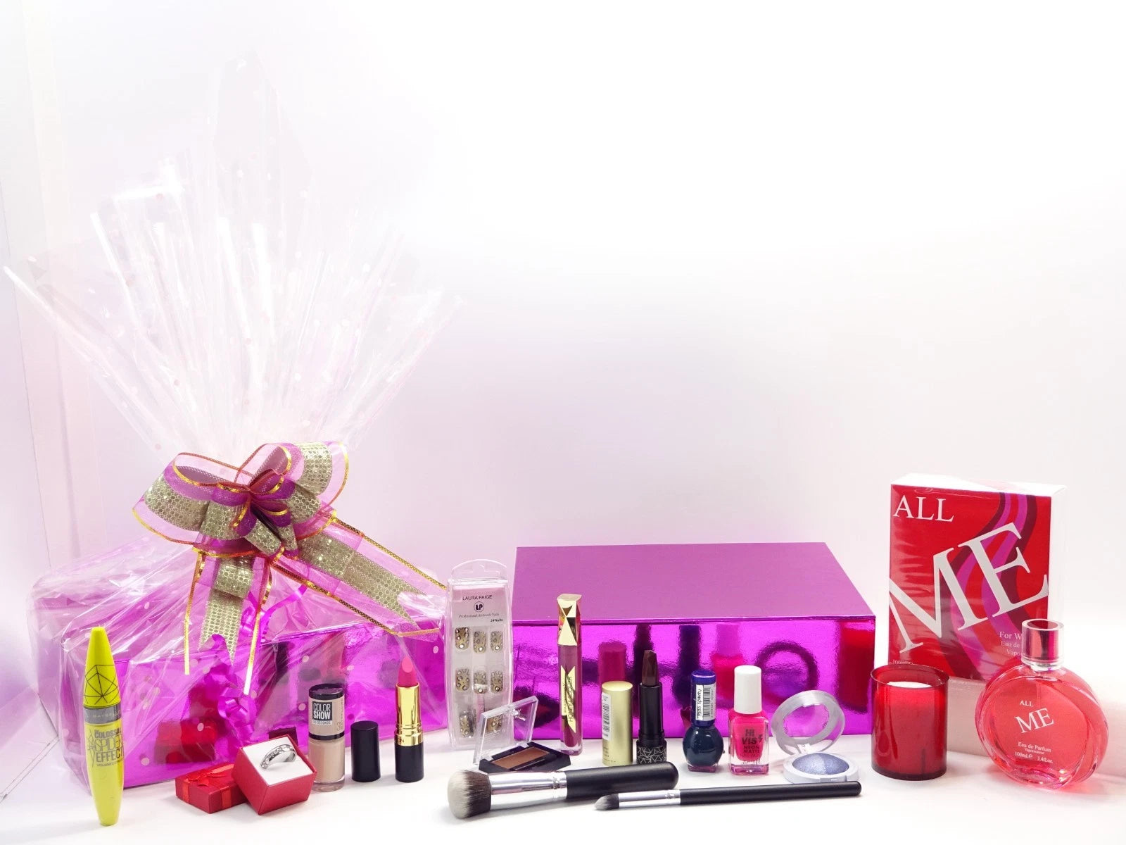 All items are protected in holographic pouches, carefully tissue-wrapped, and beautifully arranged inside the premium magnetic closure pink beauty box, then wrapped in clear cellophane with pink dots and finished with a luxury ribbon bow—The Perfect Gift For Any Occasion.