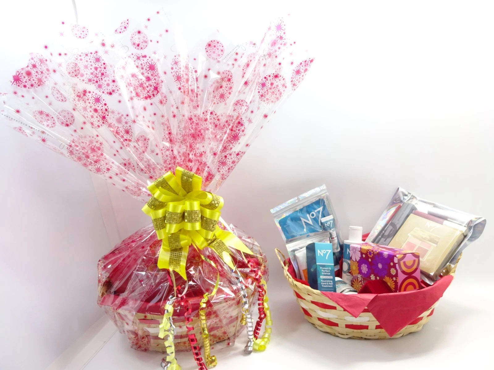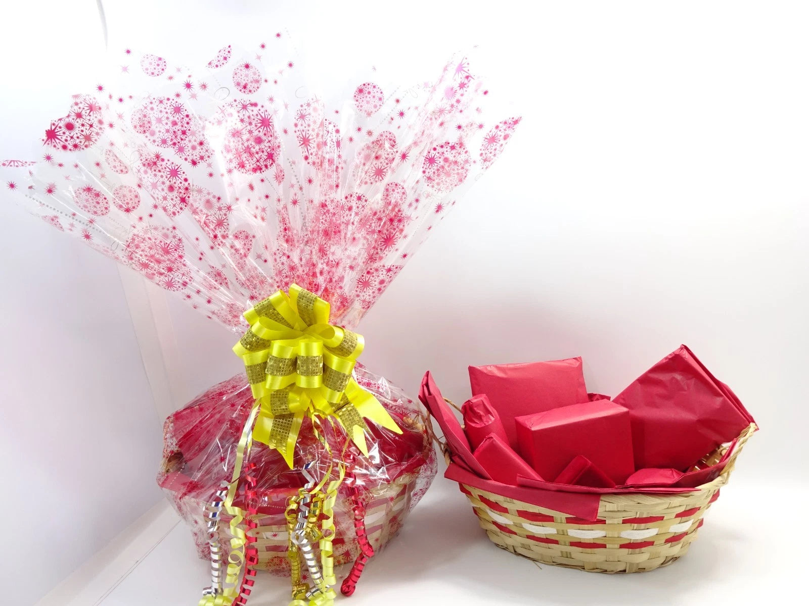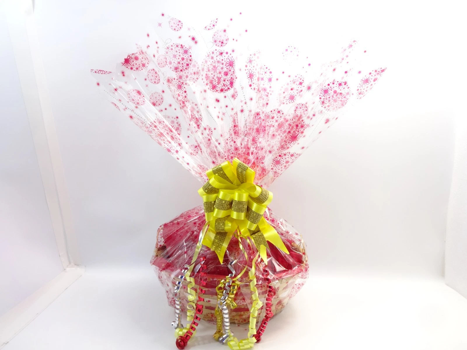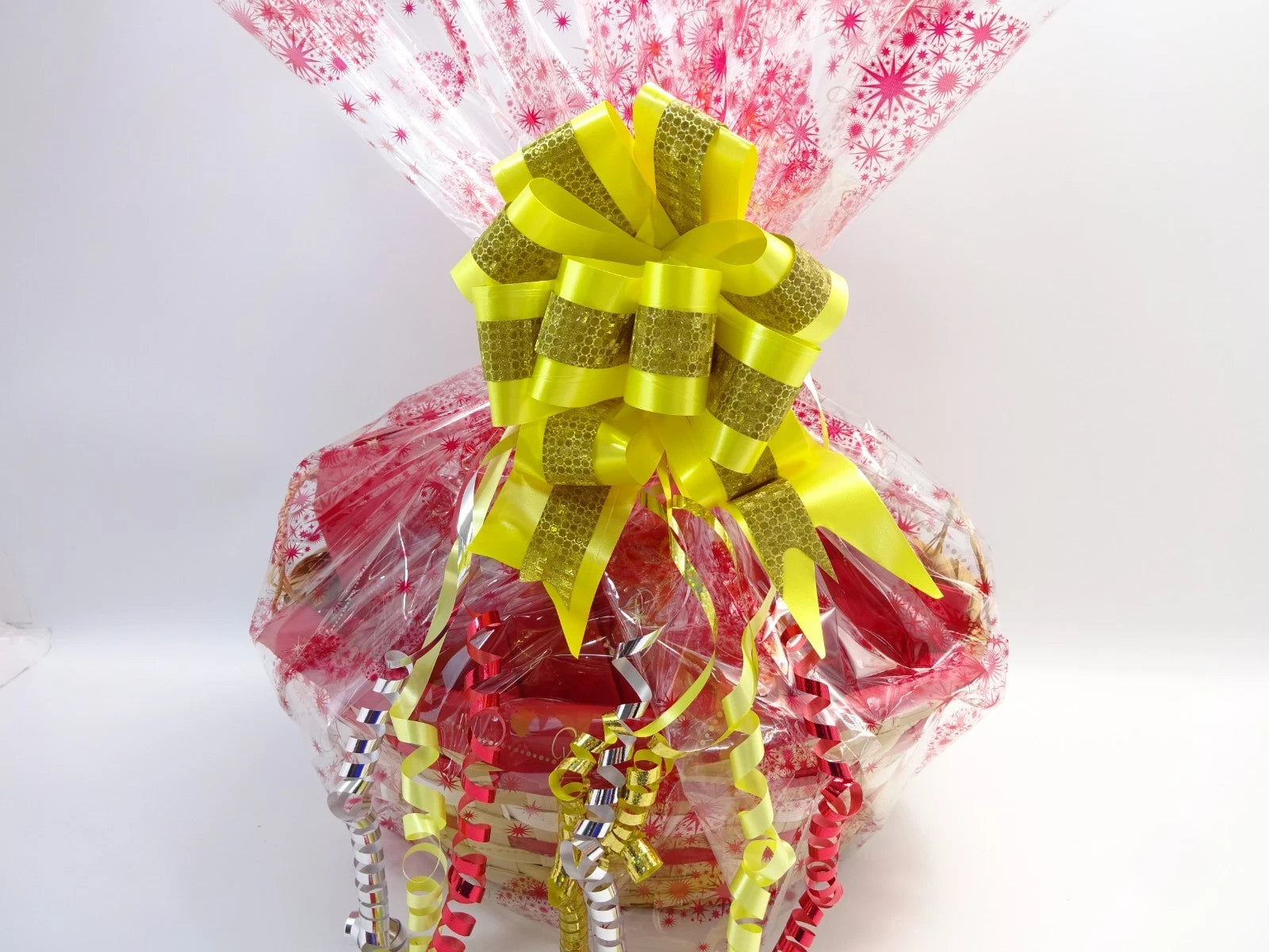 Luxurious Presentation: Beautifully gift-wrapped wicker basket in festive cellophane with a golden yellow bow and red tissue accents, creating a premium display.