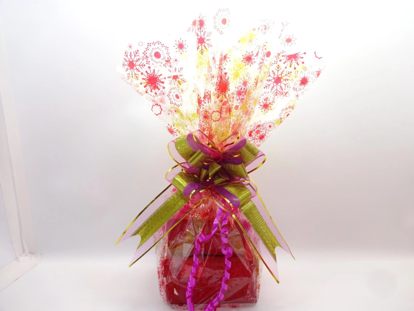 All items are placed in transparent foil pouches individually tissue wrapped and beautifully arranged in red luxury boxes tied with satin bows, then wrapped in festive cellophane with decorative ribbon – creating a ready-to-gift masterpiece.