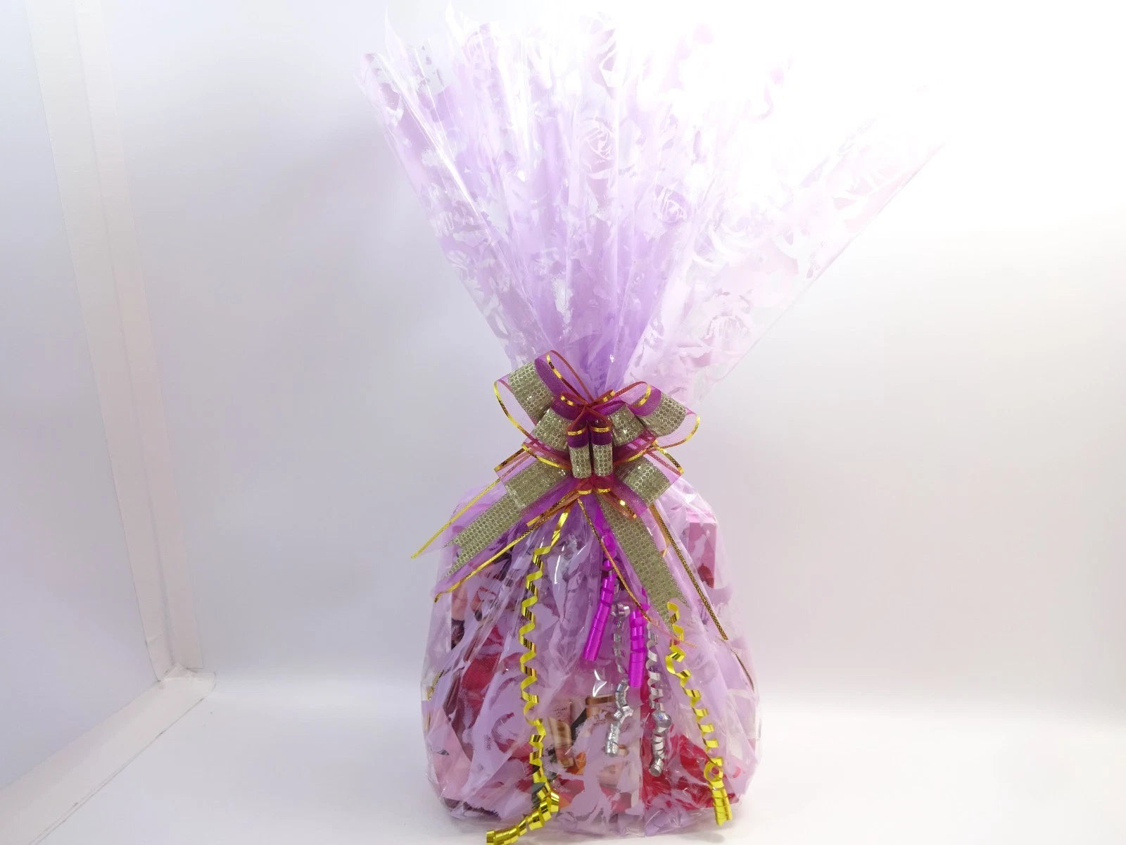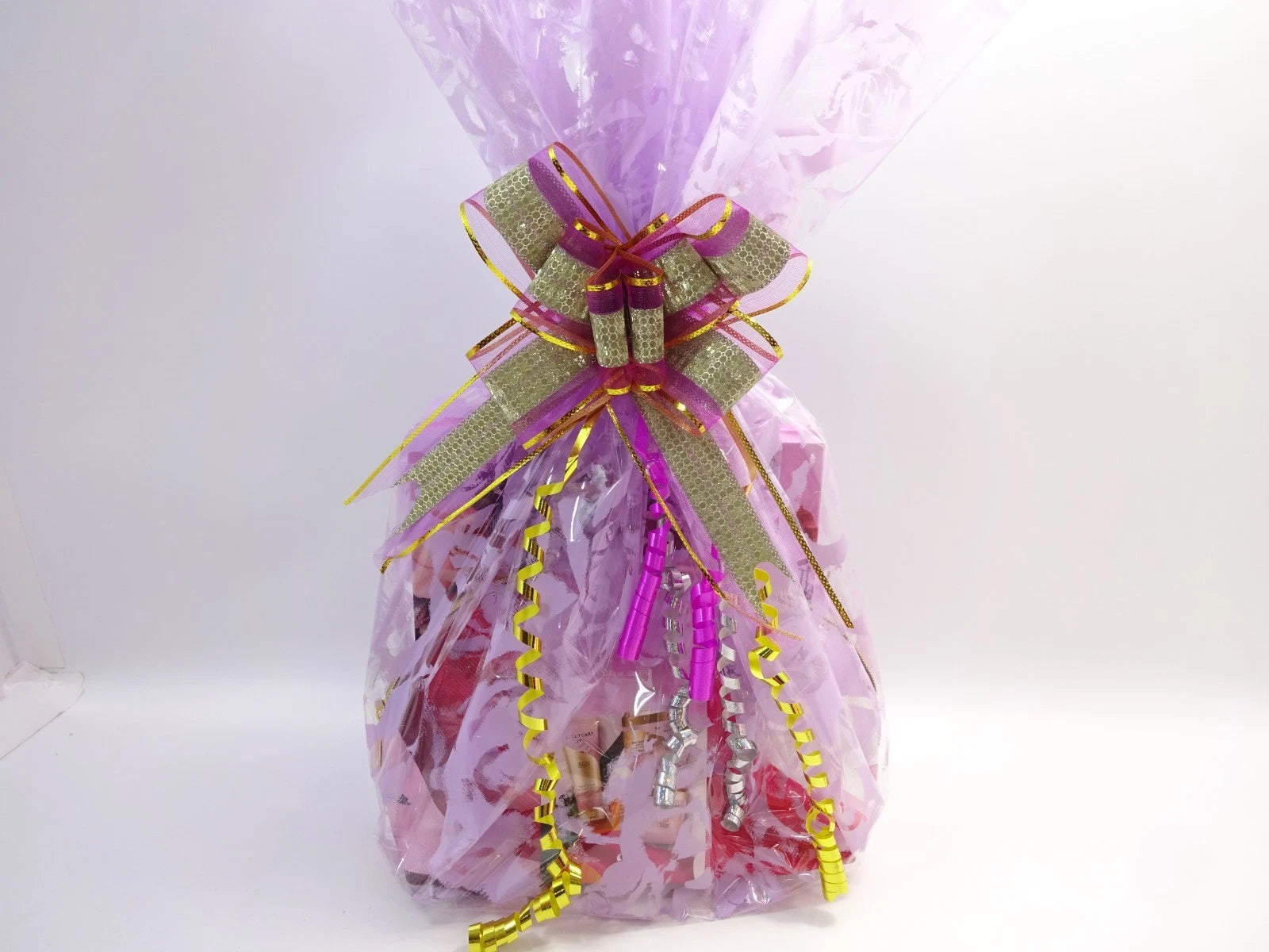 Premium Presentation: Wrapped in lilac floral cellophane with layered gold, pink and purple ribbon for a high-end finish.