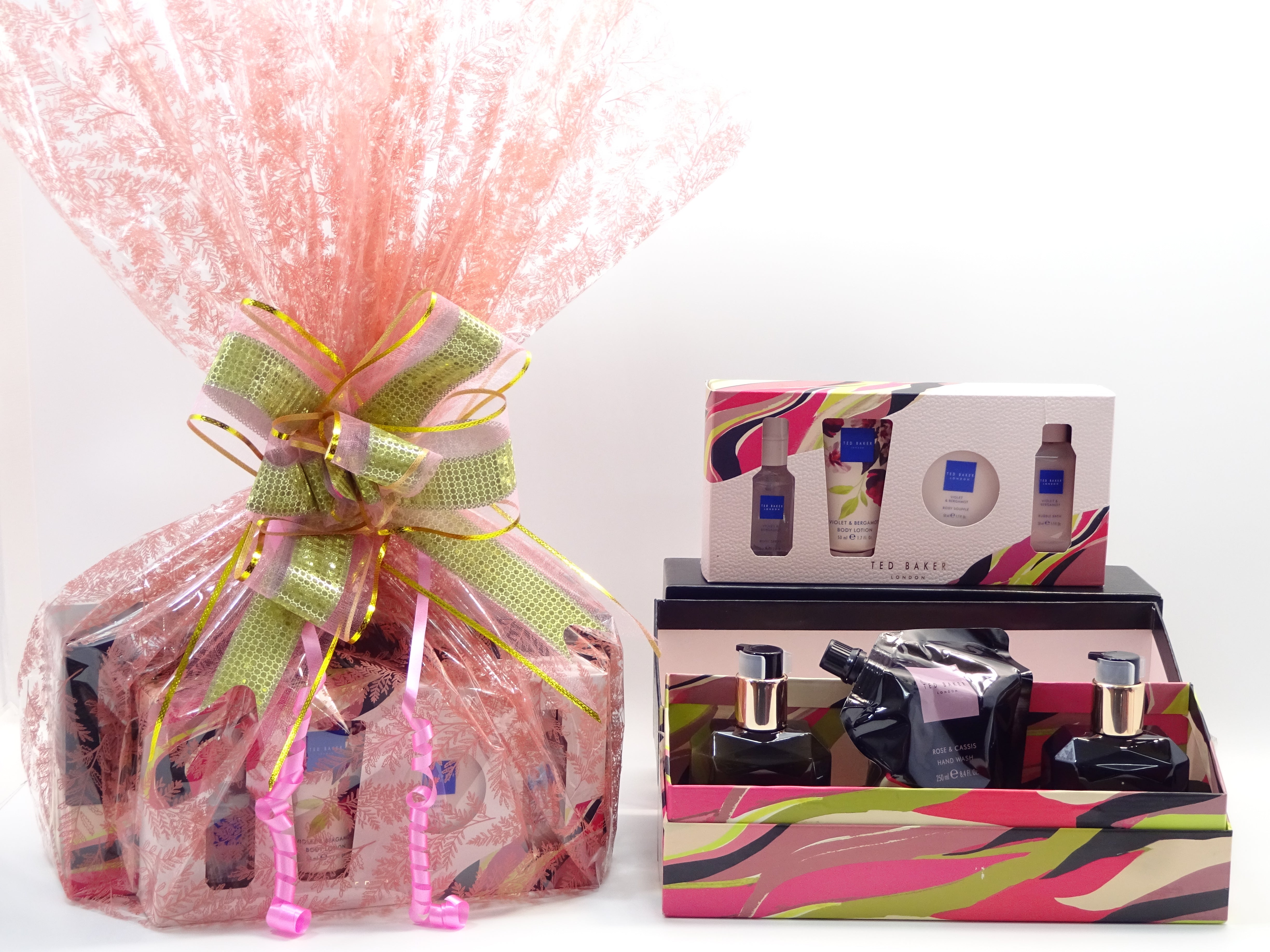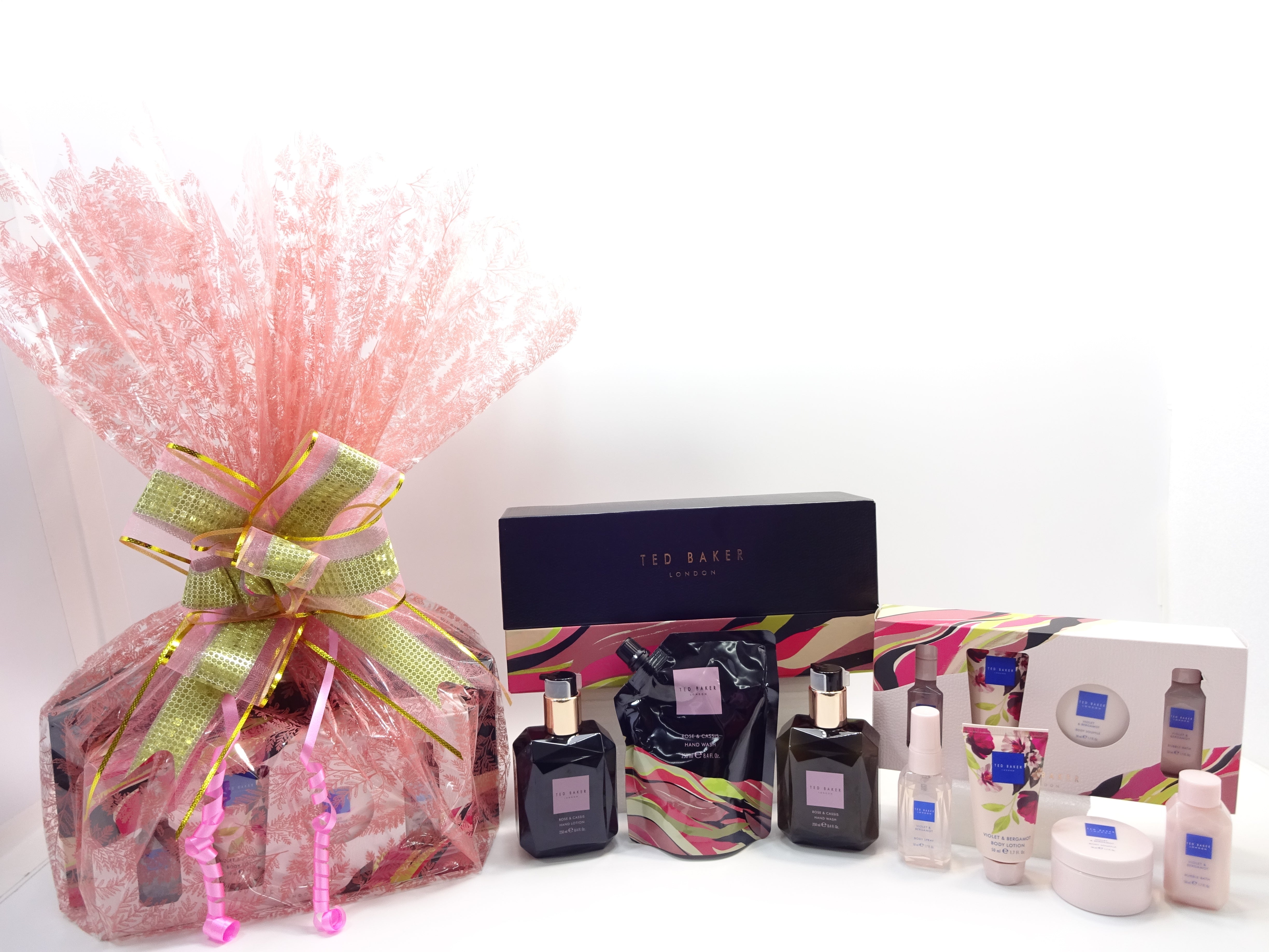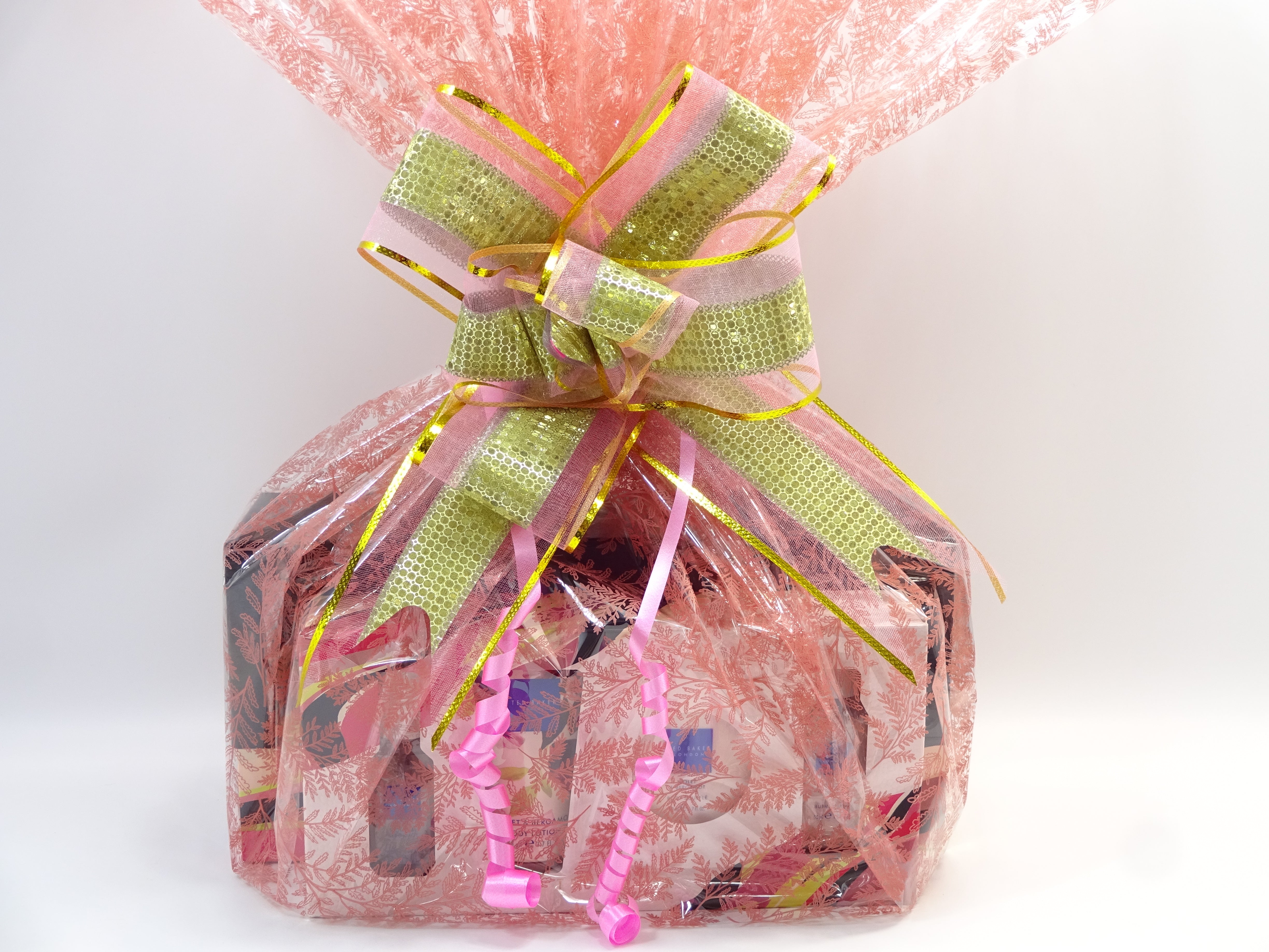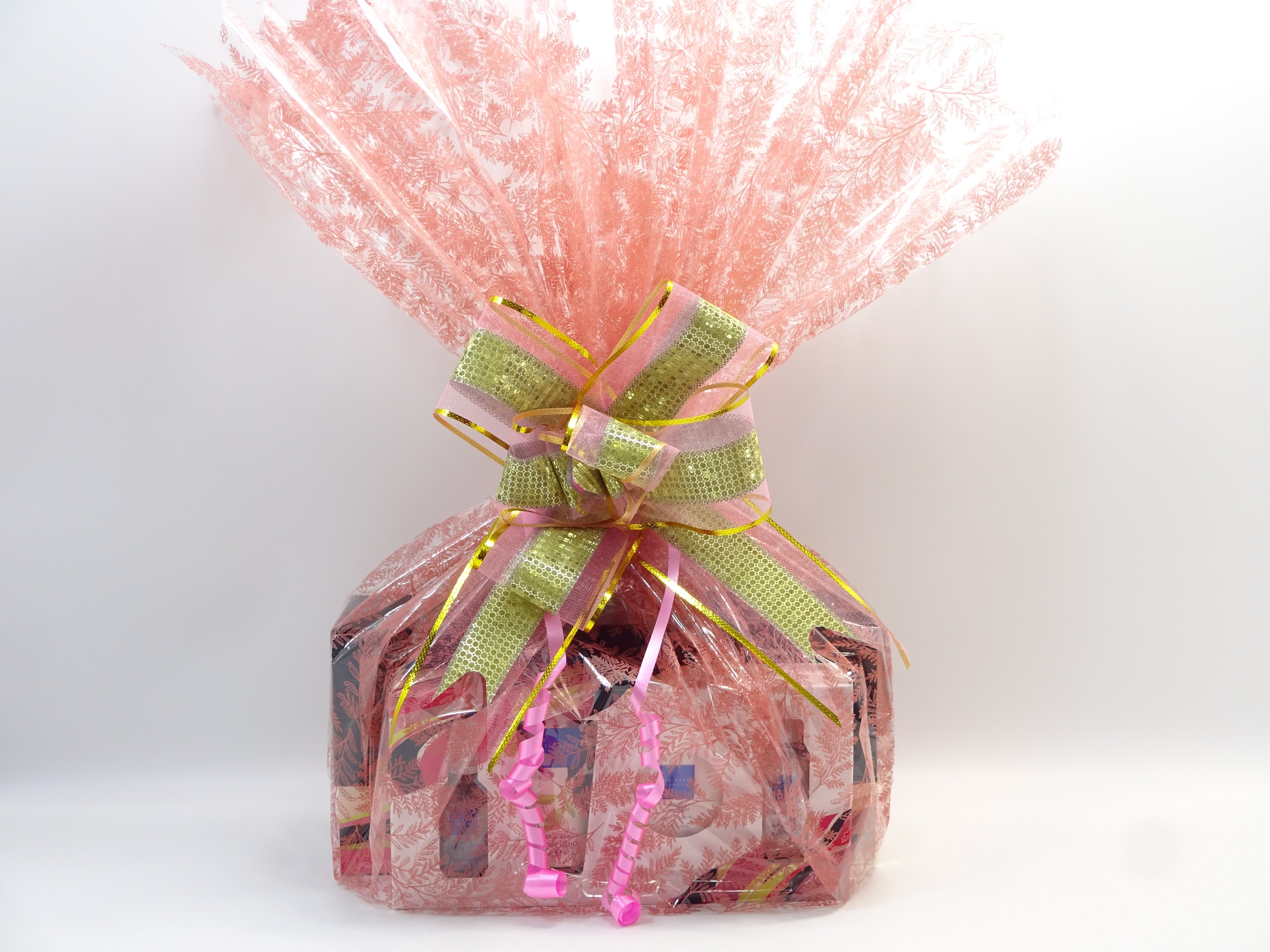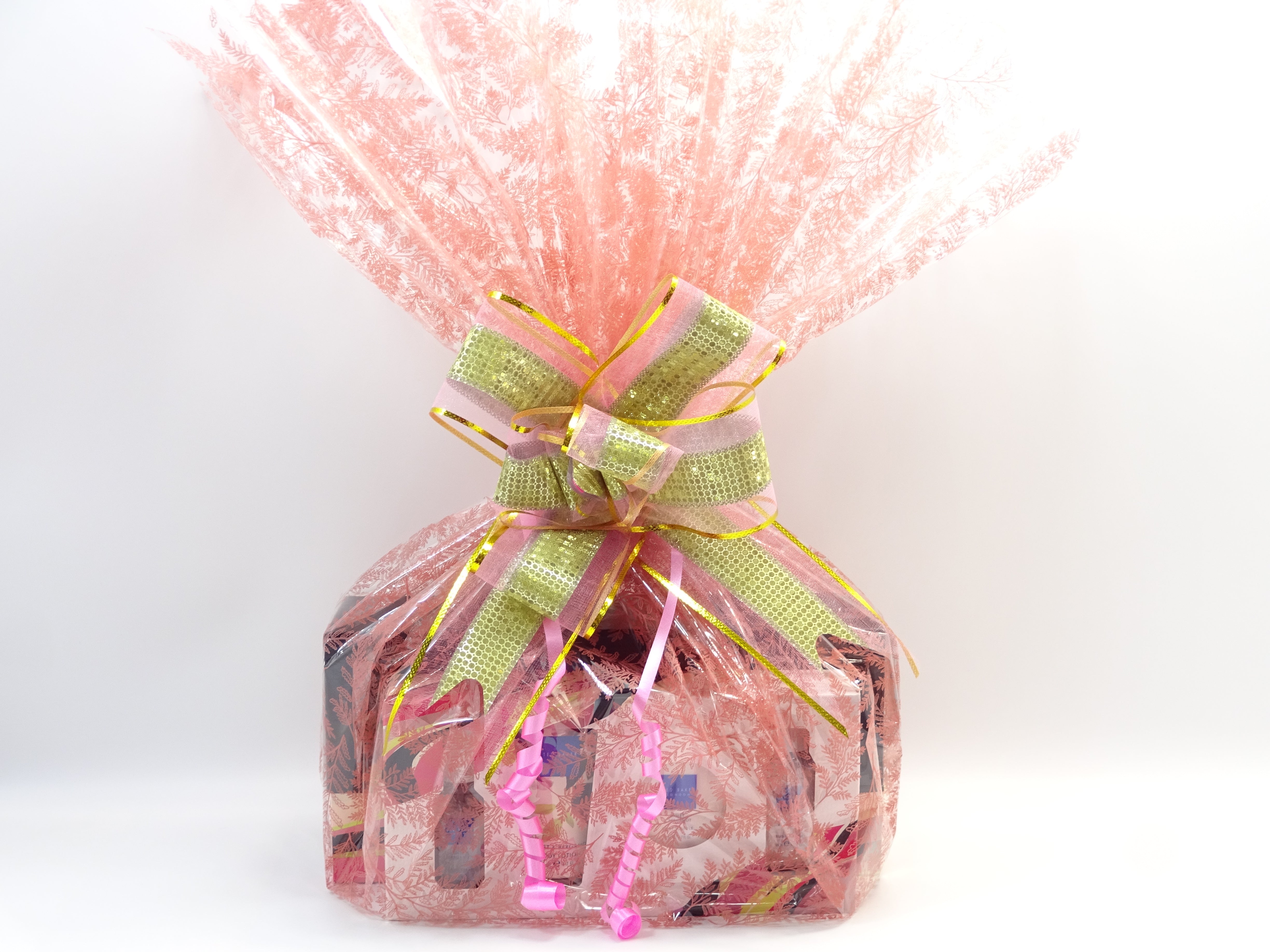 All items are beautifully wrapped in a pink cellophane Wrap and secured with Pink/Gold Bow