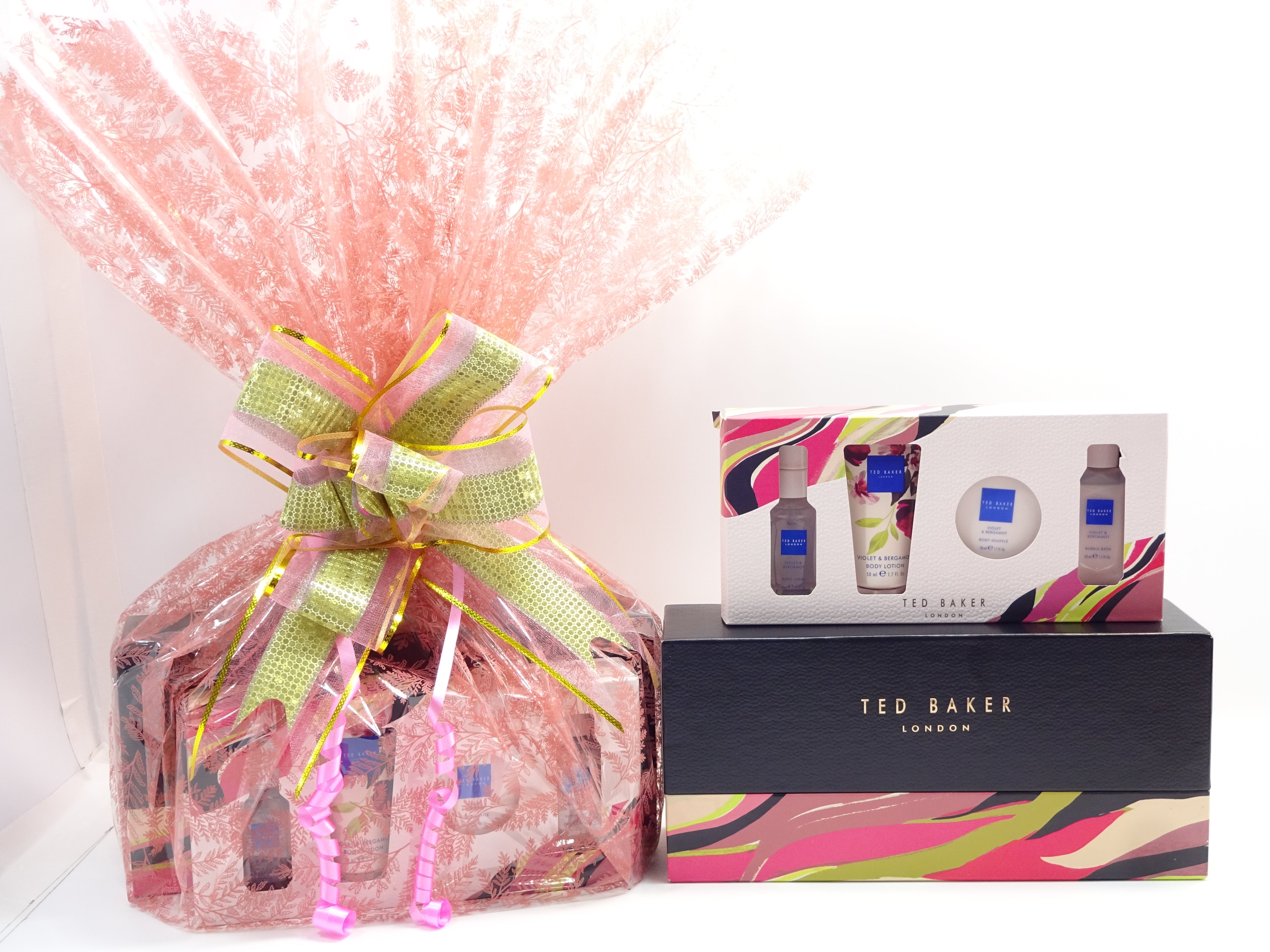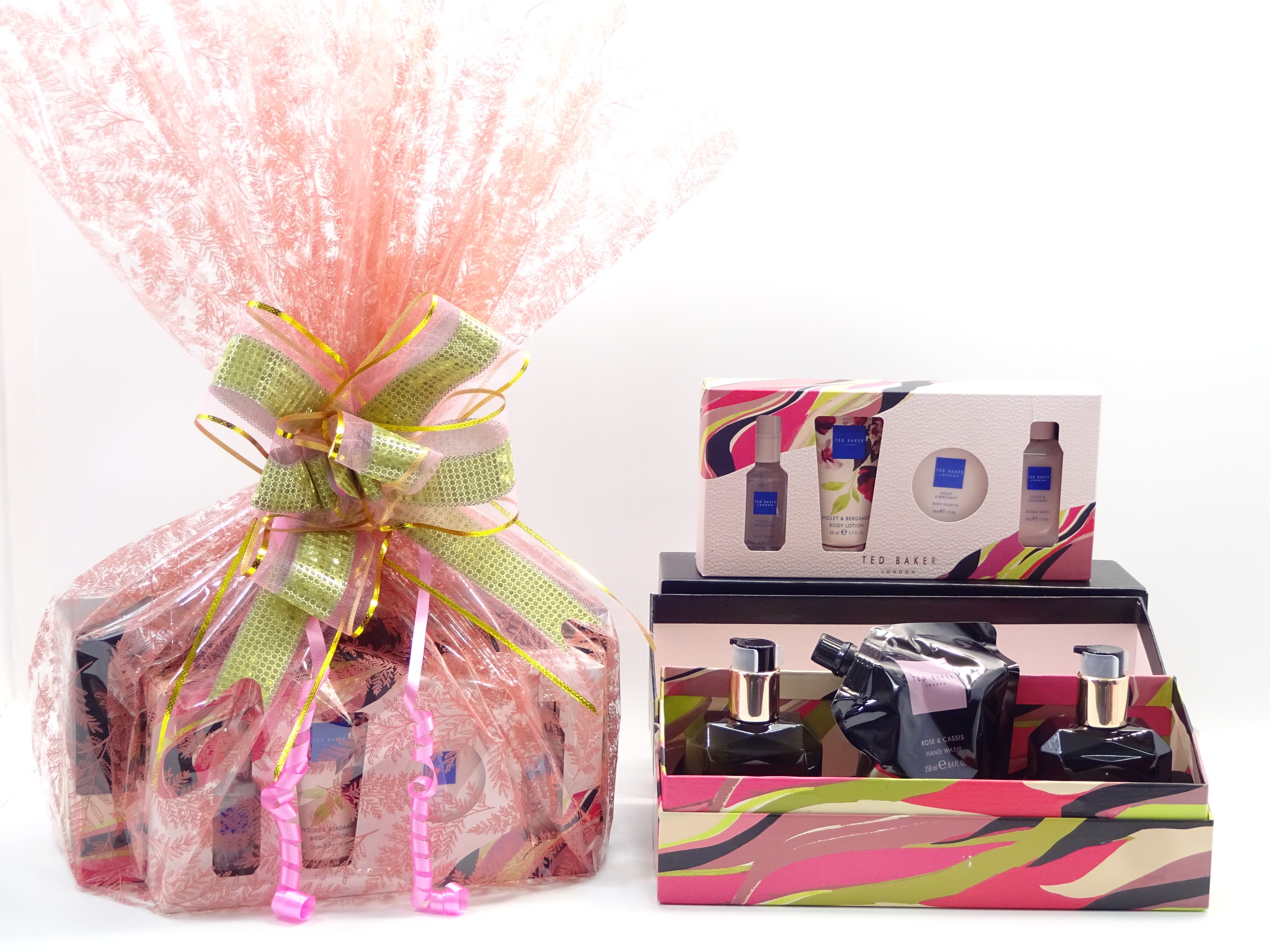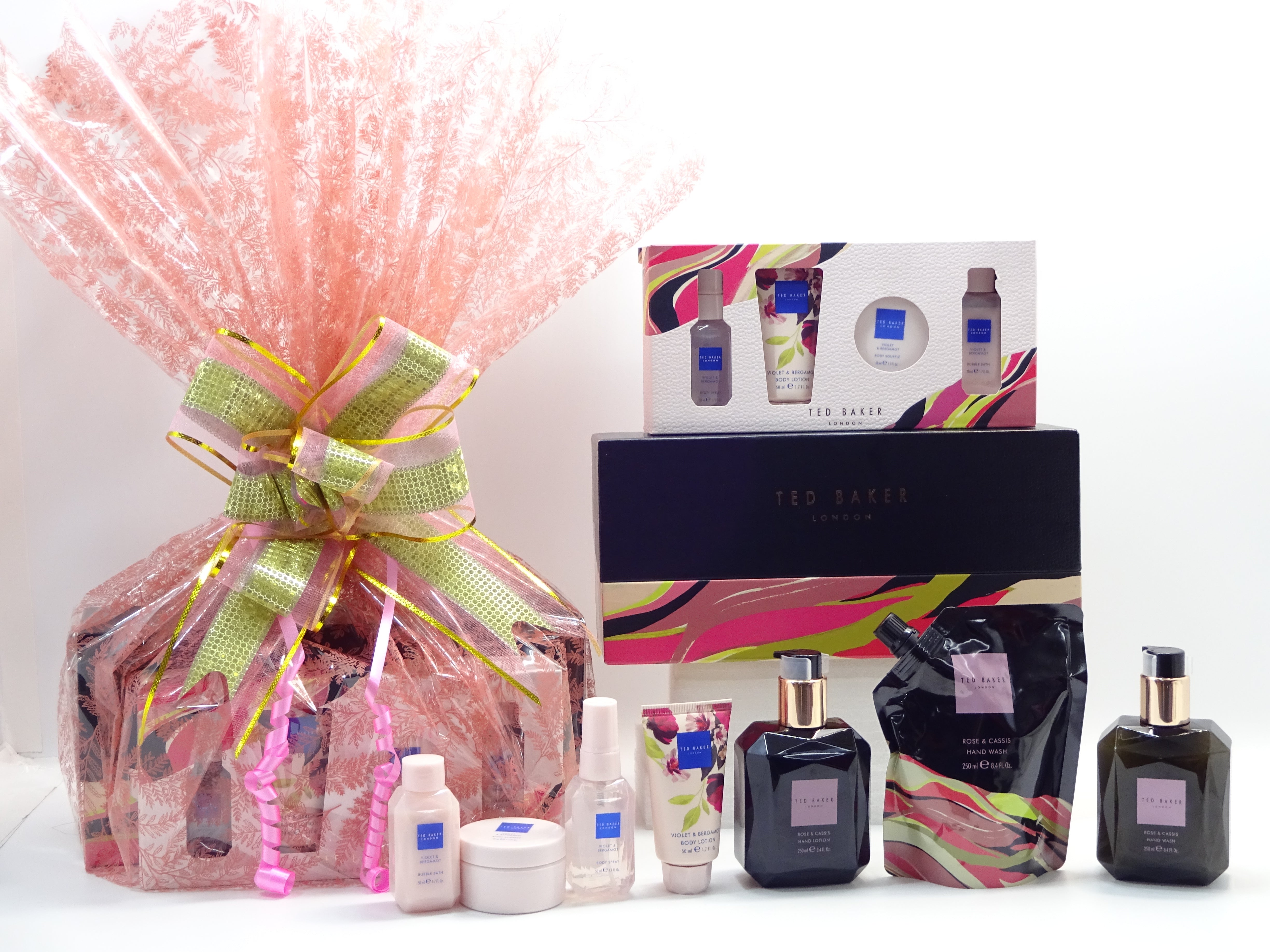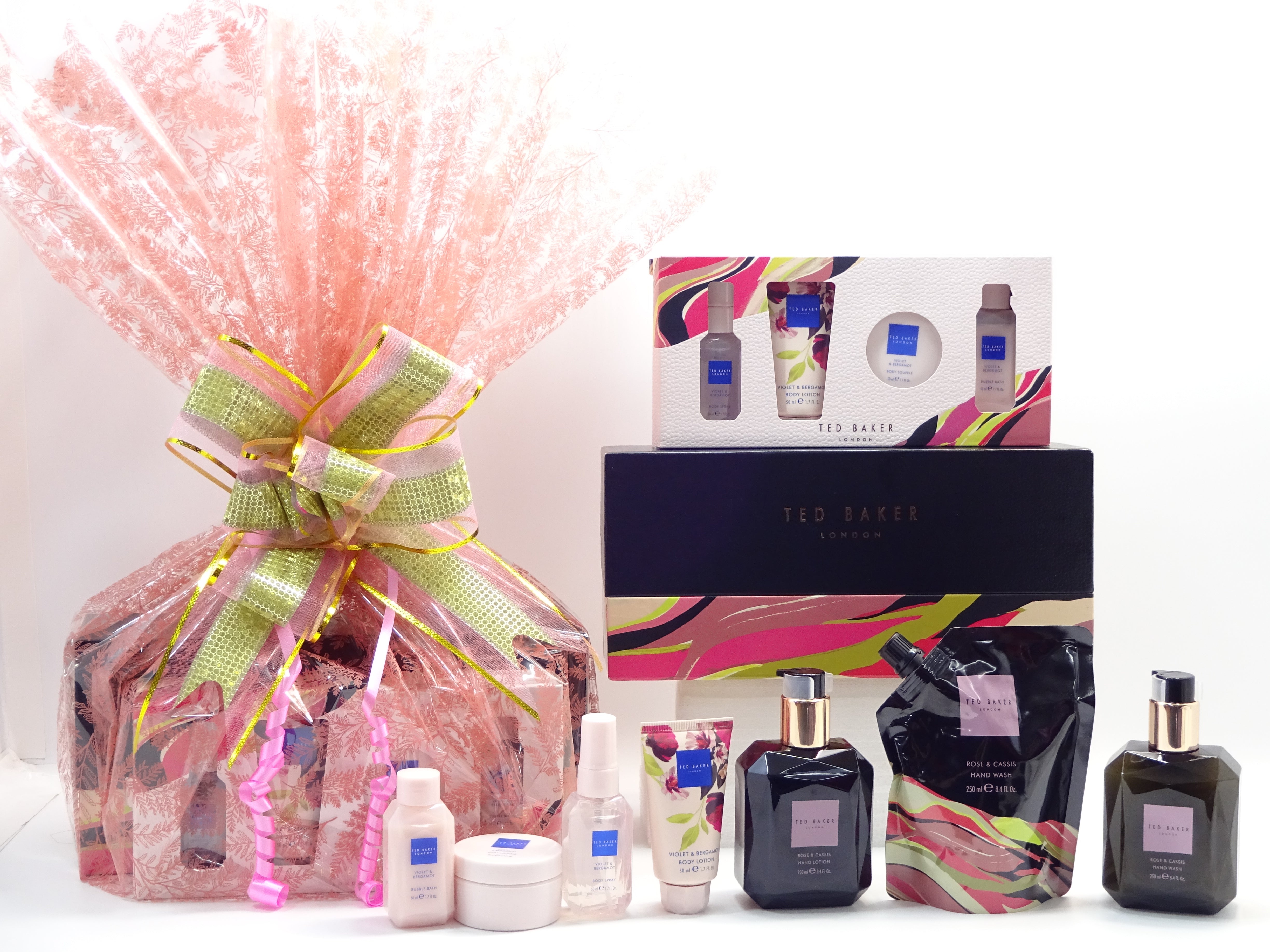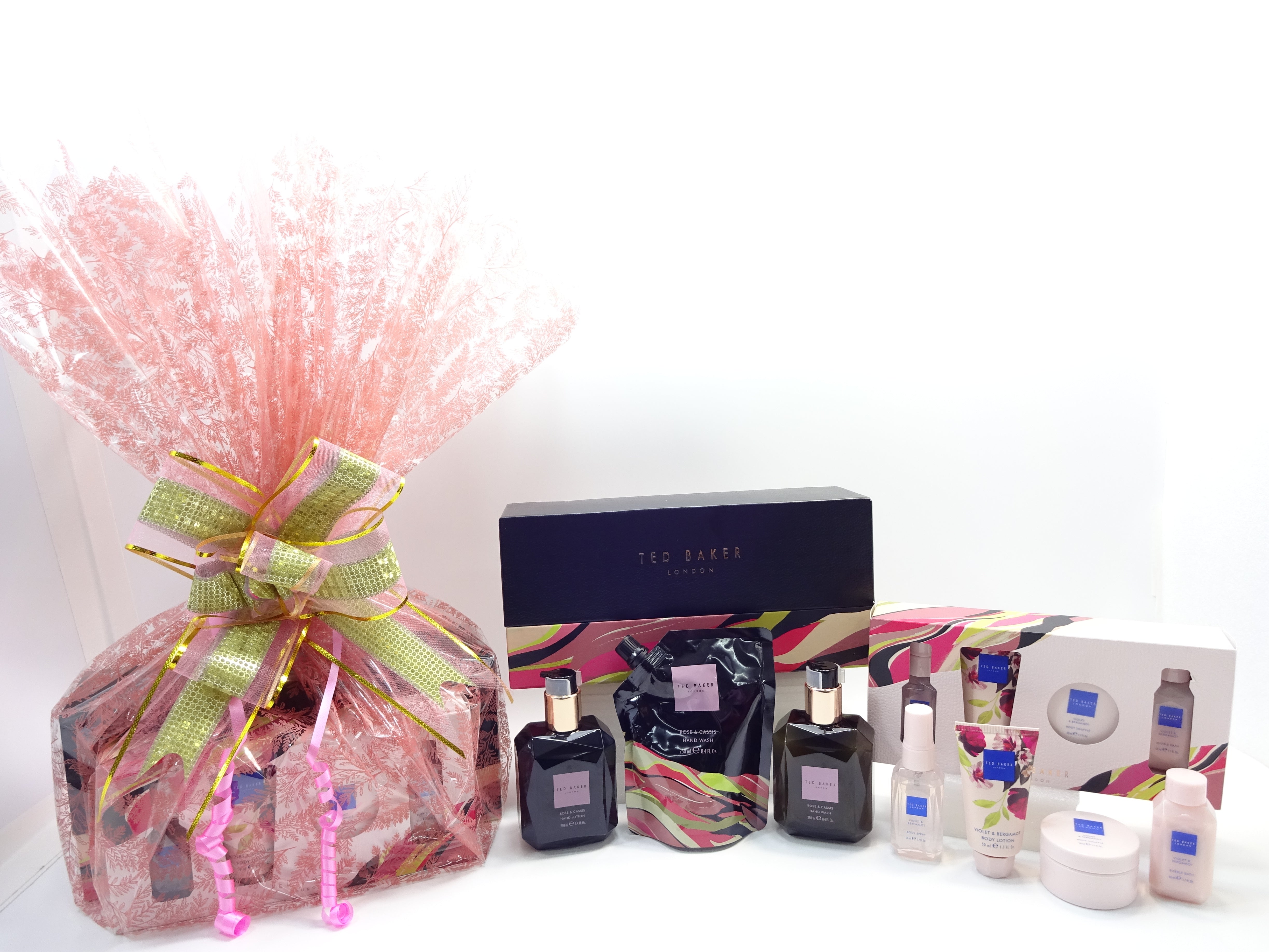 All items are beautifully wrapped in a pink cellophane Wrap and secured with Pink/Gold Bow