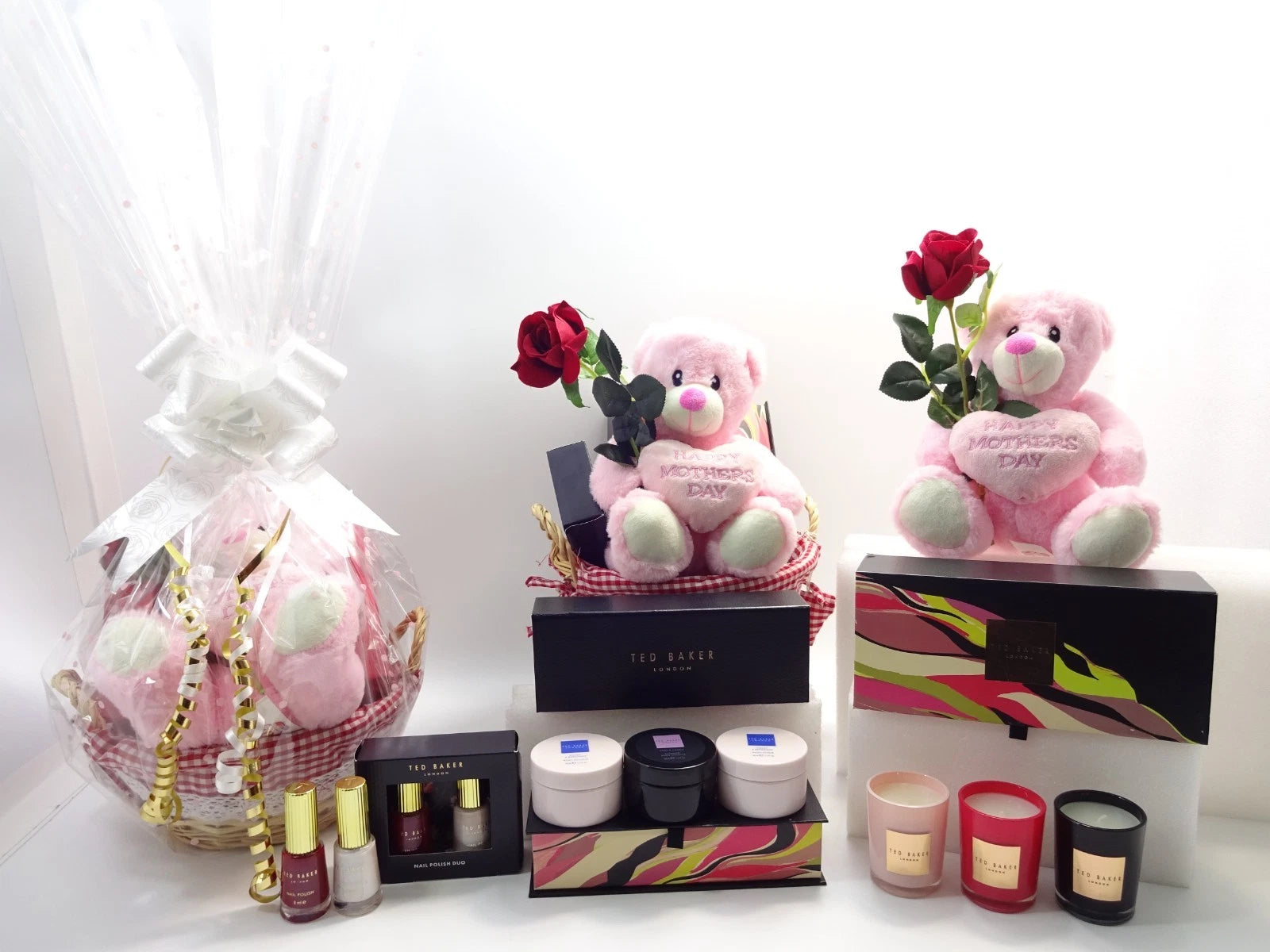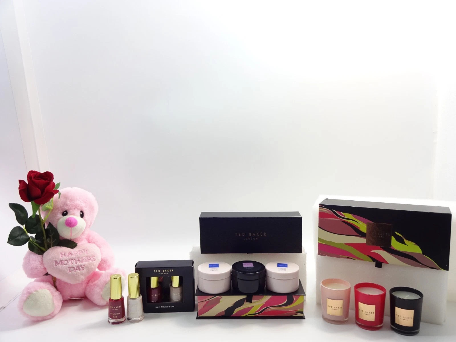 A beautifully curated 10-piece Ted Baker Mother’s Day hamper featuring luxury candles, a nail polish duo, indulgent body soufflés and a sentimental teddy bear – the perfect elegant gift to celebrate Mum in style.