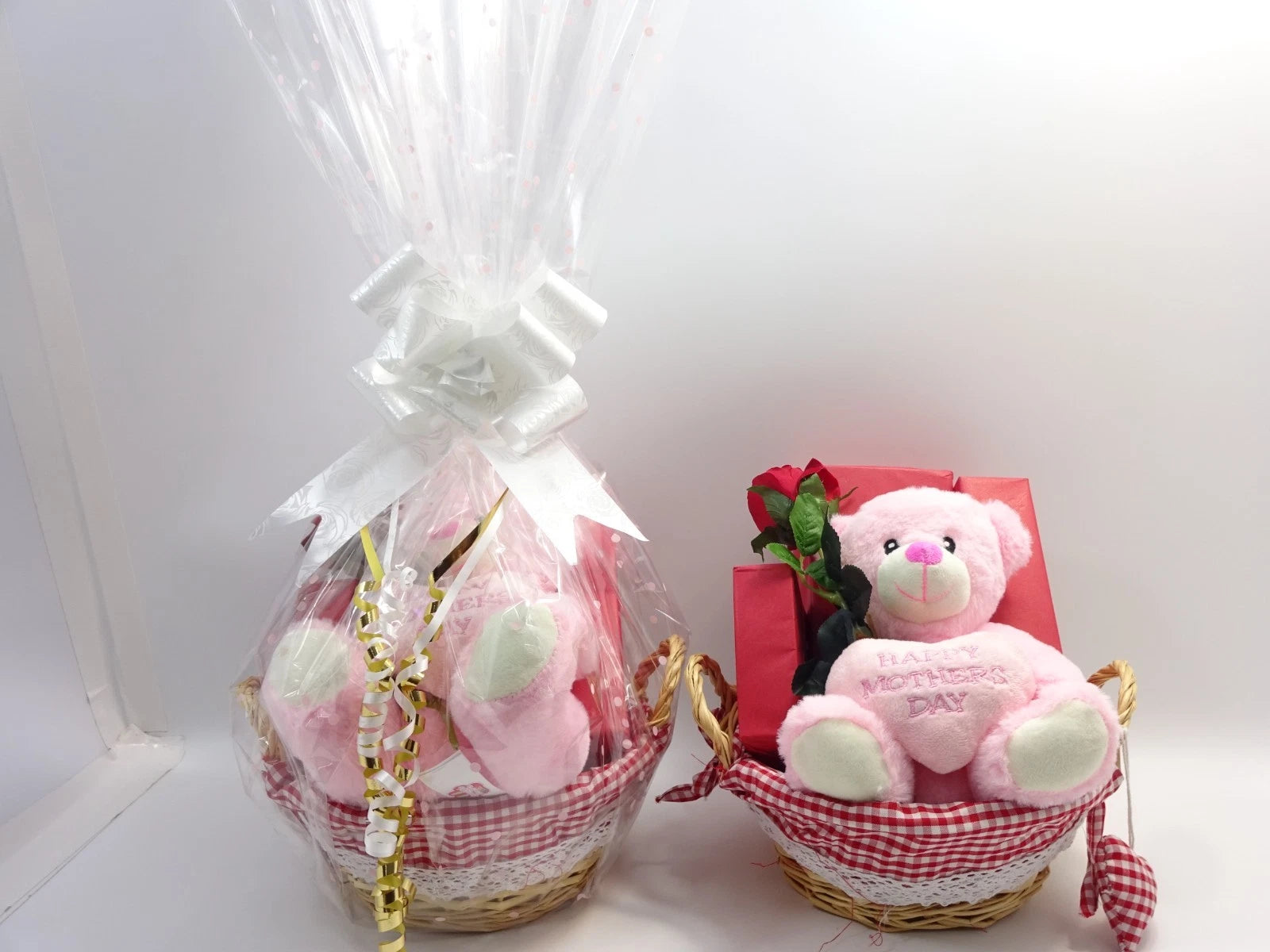 Each item is carefully positioned for a stunning visual display, including the soft pink “Happy Mother’s Day” teddy holding a red rose for that heartfelt finishing touch. The hamper is professionally wrapped in clear decorative cellophane and finished with a large statement white bow and cascading ribbon curls, making it ready to gift the moment it arrives.