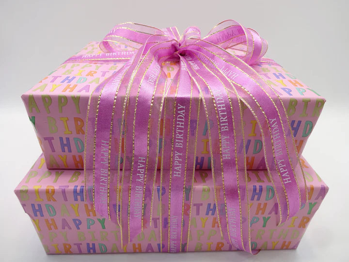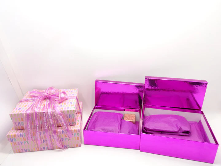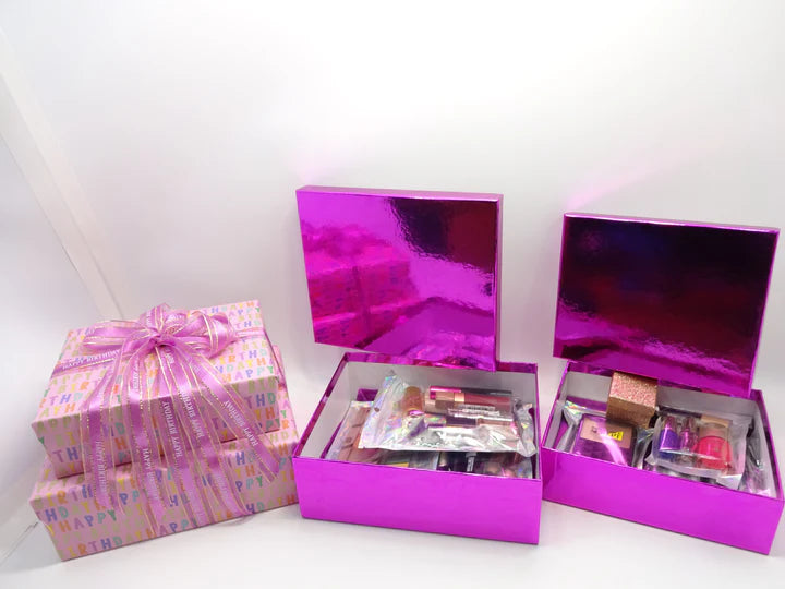 All items are neatly arranged in transparent pouches and tissue wrapped in a double tier hot pink gift boxes, lined with soft pink tissue paper, and secured in a Pink Happy Birthday Inscribed wrapping paper with a white ribbon bow - A luxurious Birthday Present.