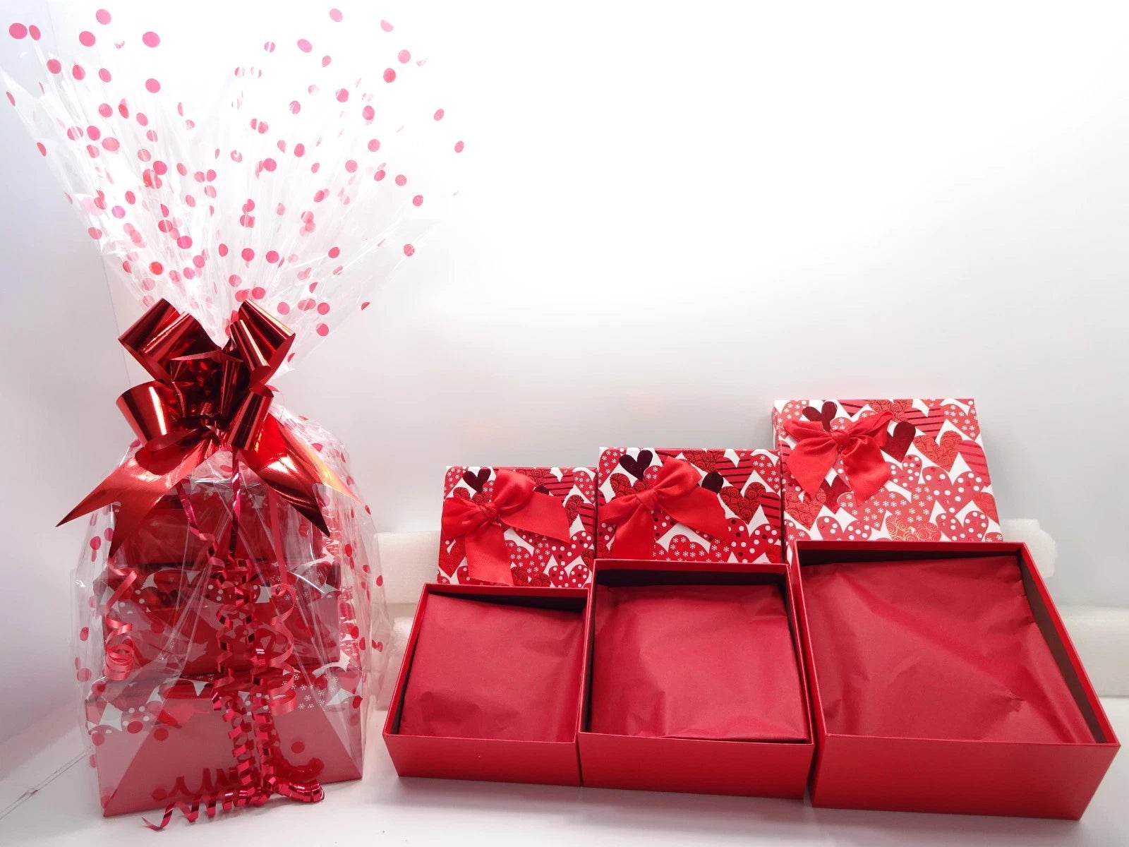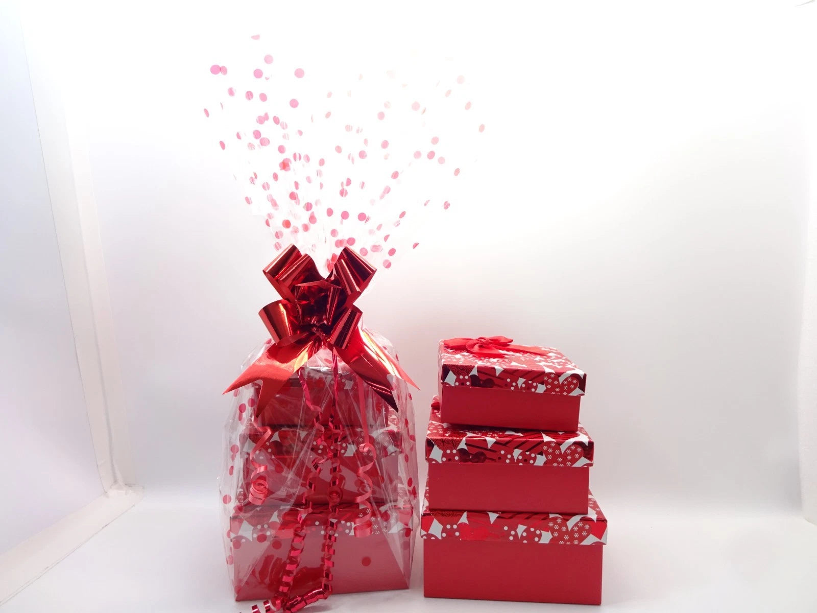 Three-Tier Presentation: Elegant red gift boxes with heart prints and satin bows create a stunning stacked display.
